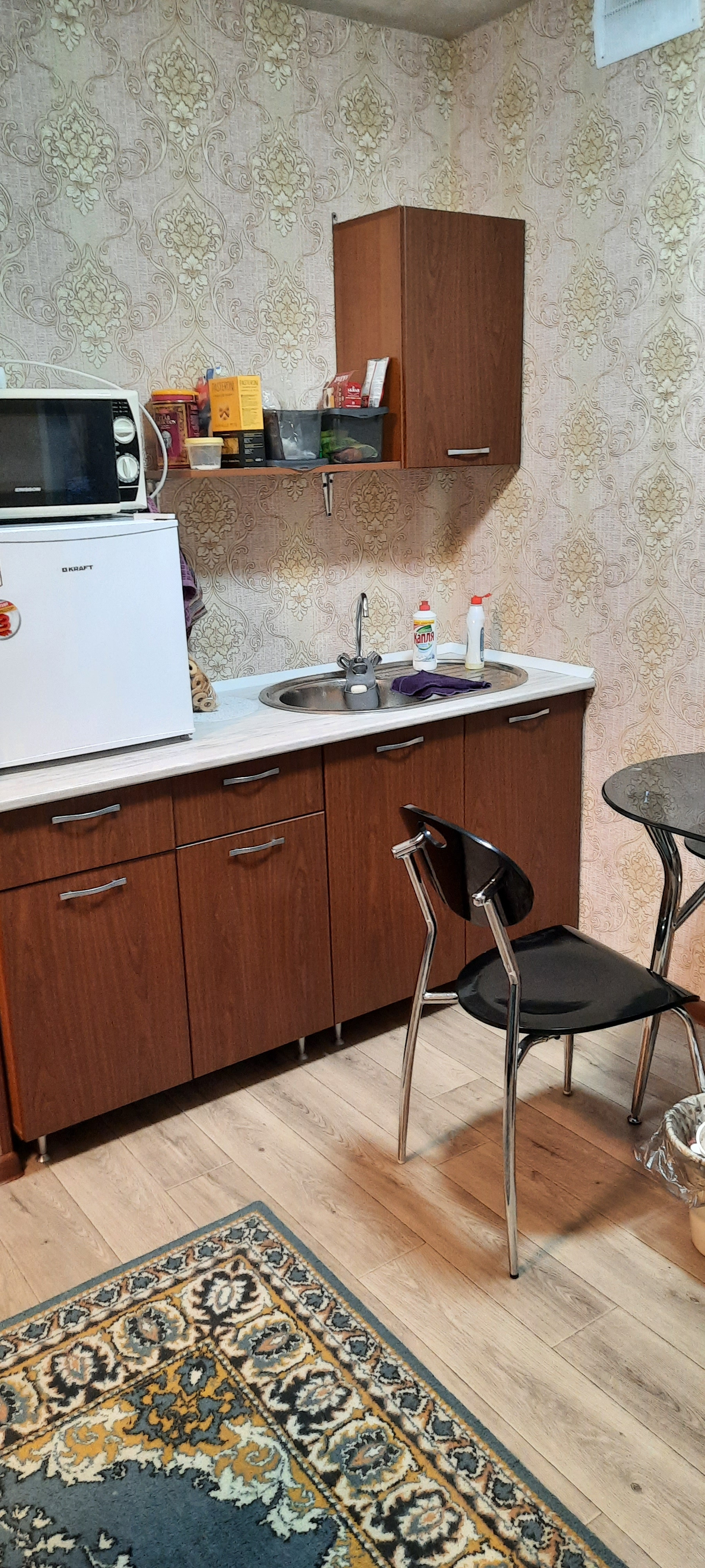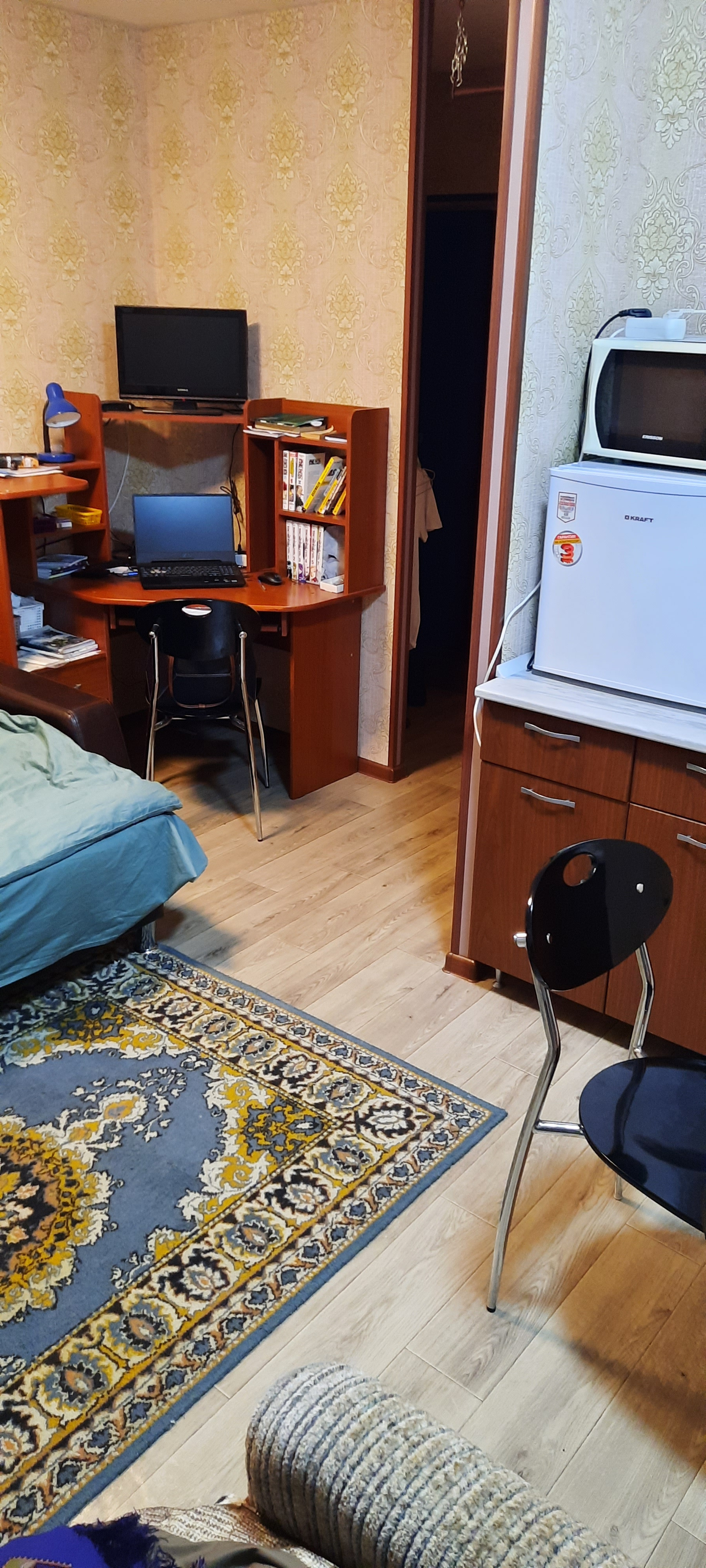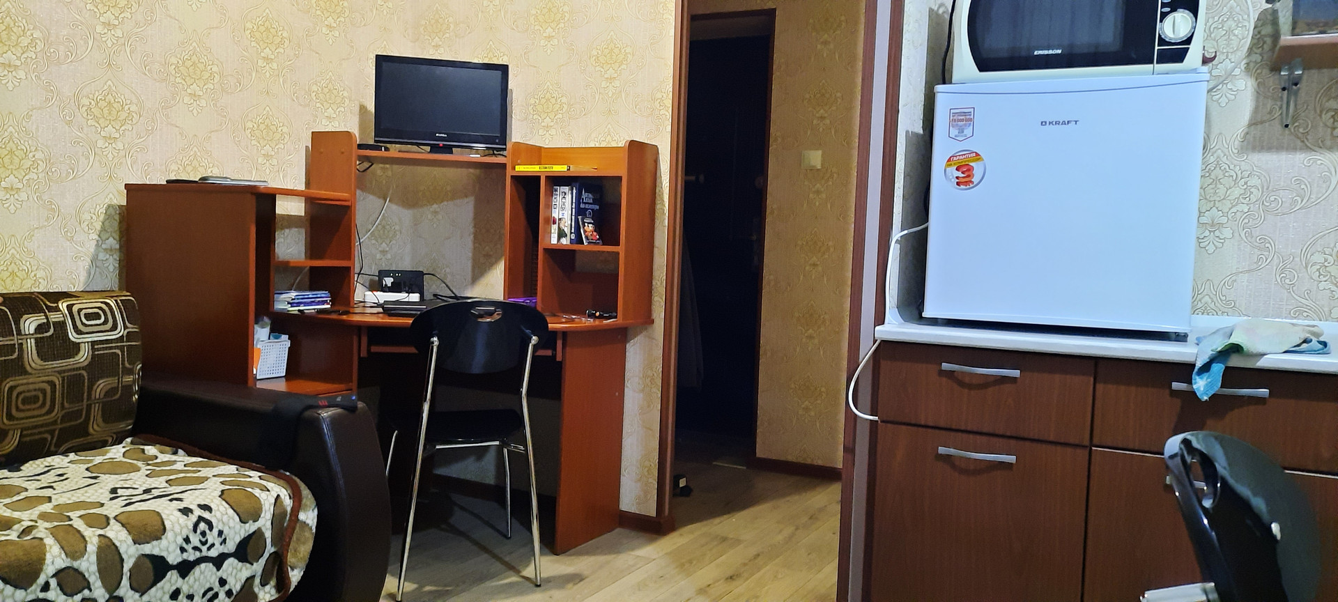 Продаётся квартира-студия в г. Глазове на Аэродромном переулке. Сделан ремонт: выравнивали пол и стены, поменяли все розетки и выключатели, стены оклеены флизелиновыми обоями, на полу - линолеум. Пластиковые окна. Не успели привести в порядок санузел, но там все в рабочем состоянии. Транспорт доступен. ГГПИ в 25 минутах пешком. Рядом гимназия N8, под окном магазин "Хлебосол". Низкие коммунальные платежи, НЕТ НАЛОГА НА НЕДВИЖИМОСТЬ. ОСТАВИМ кухонную мебель и компьютерный стол. Есть интернет и телевидение.