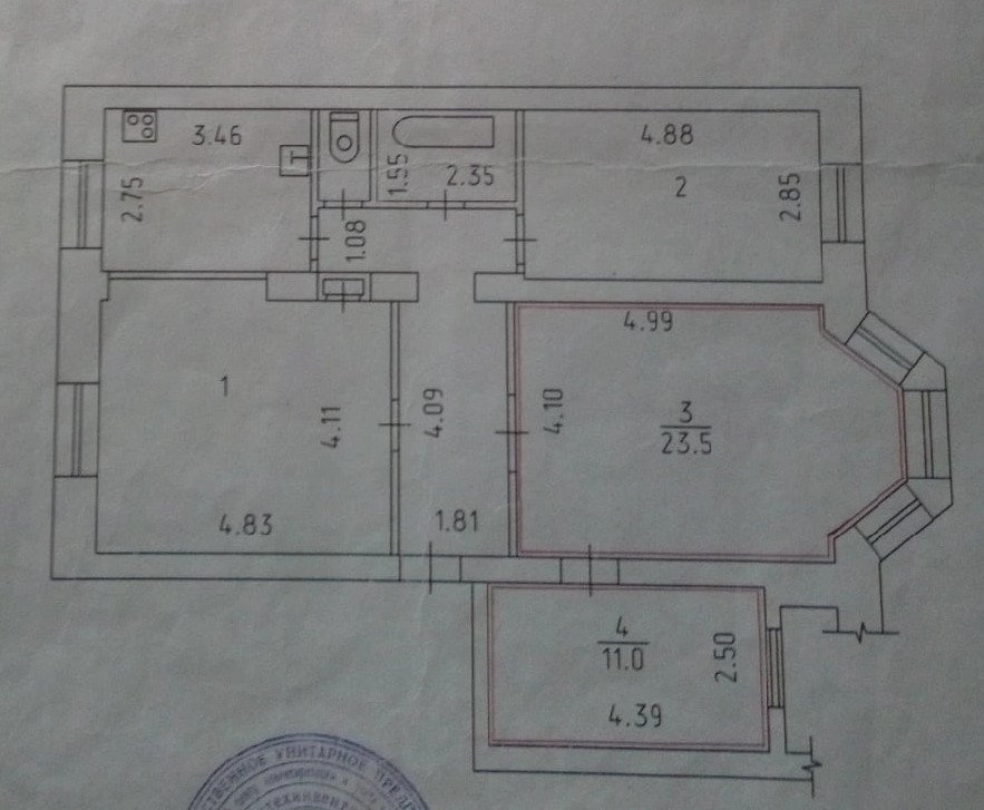 Стены: по периметру квартиры, и между комнатами с номерами 2, 3, 4 - капитальные кирпичные (шириной 60 см), что обеспечивает отличную шумоизоляцию и аудиокомфорт (защита от звуков извне квартиры).