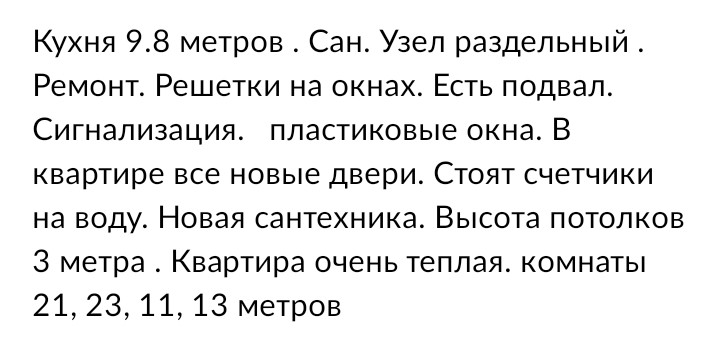 Кухня 9.8 метров . Сан. Узел раздельный . Ремонт. Решетки на окнах. Есть подвал. Сигнализация.   пластиковые окна. В квартире все новые двери. Стоят счетчики на воду. Новая сантехника. Высота потолков 3 метра . Квартира очень теплая. комнаты 21, 23, 11, 13 метров
