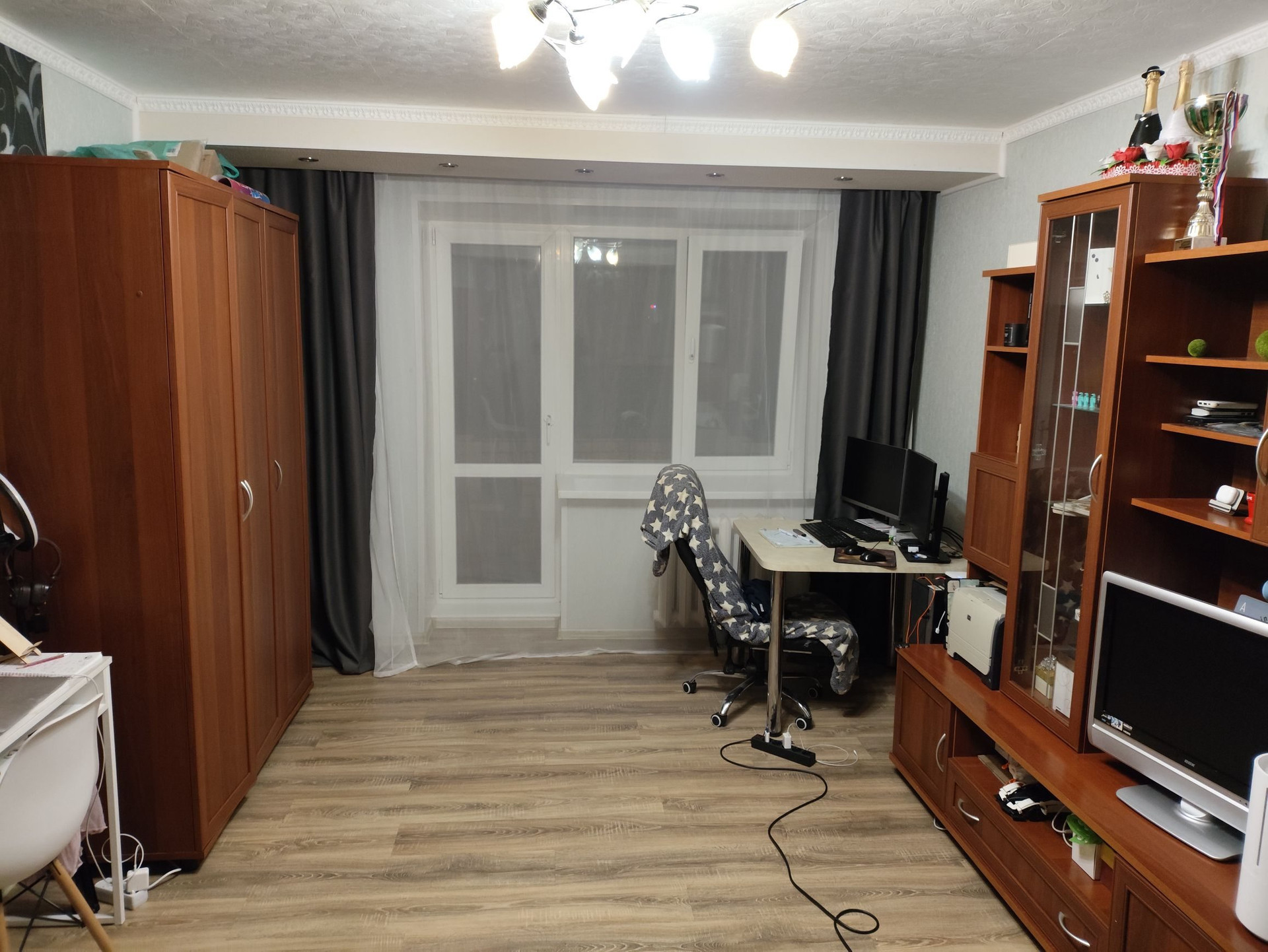 Выполнена перепланировка, узаконена. Остаётся кухонный гарнитур. В комнате установлены пластиковые окна. С лоджии прекрасный вид на реку и площадь Свободы. В квартире очень тепло.