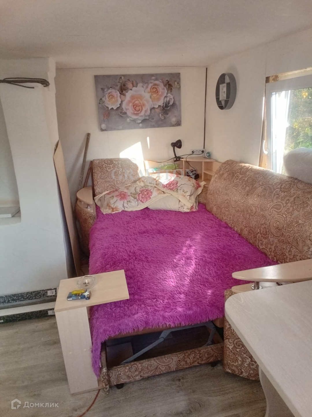 Домик благоустроенный, свет, вода, санузел, душевая в доме, септик, пластиковые окна, пластиковая дверь, выровнены стены, потолок. Действующий газ у ворот. Участок подходит и под строительство нового дома,  до остановки и магазина 7 минут пешком.