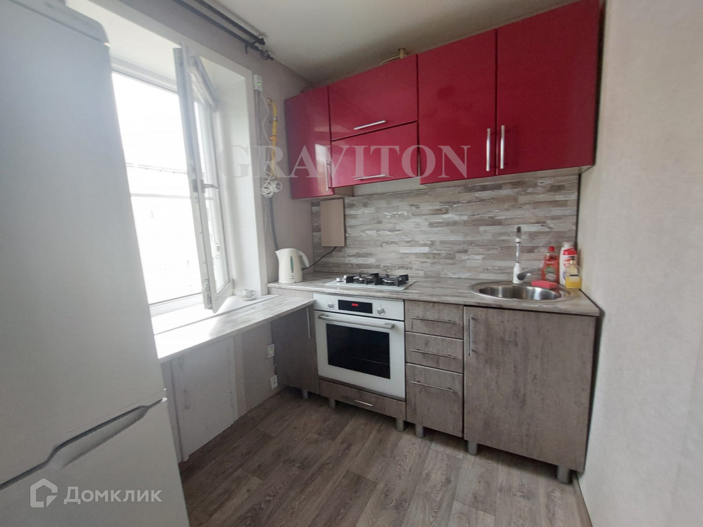 Кухня удобна для хозяйки, все под рукой: чайник, холодильник, газовая плита 2 конфорки, духовой шкаф электро. Вид из окна на детскую площадку.