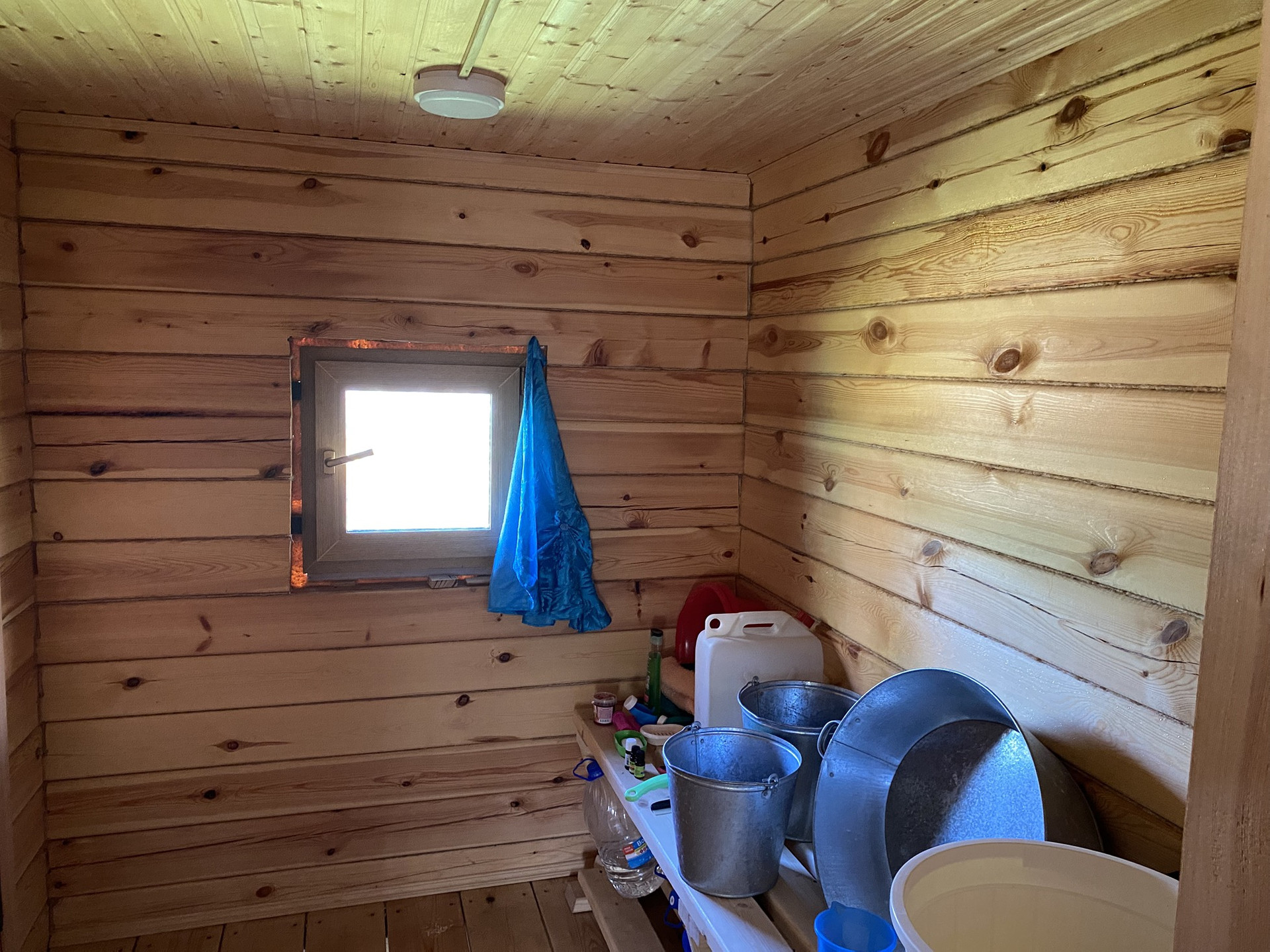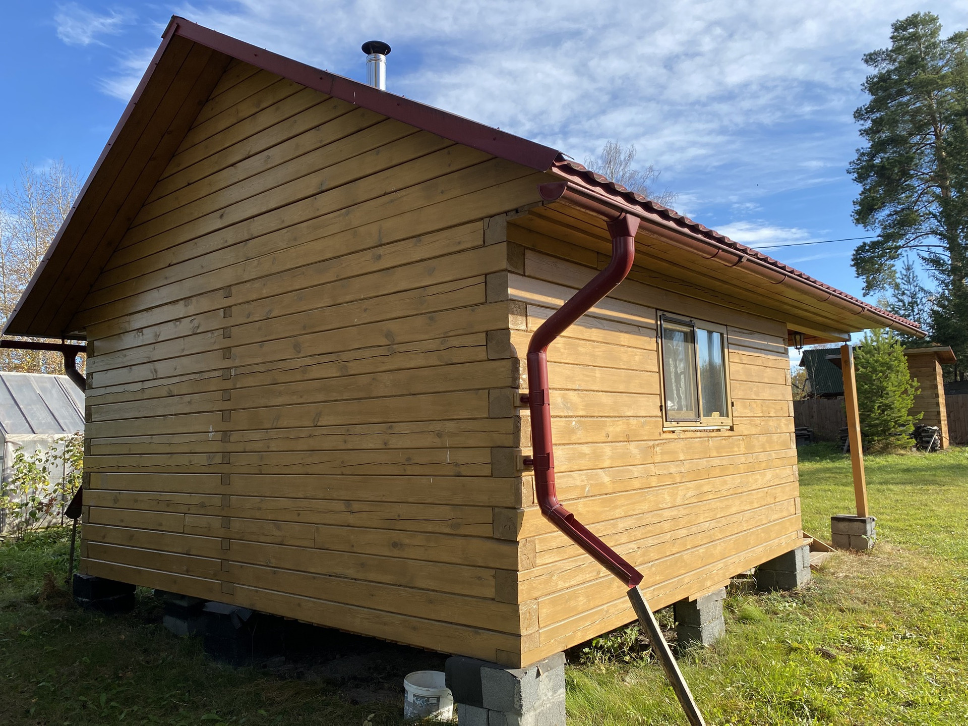 Фундамент бани столбчатый. Брус 15х15 см. С утеплением джутом. В комнате отдыха пол утеплен минеральной ватой. Потолок во всех комнатах утеплен керамзитом.
