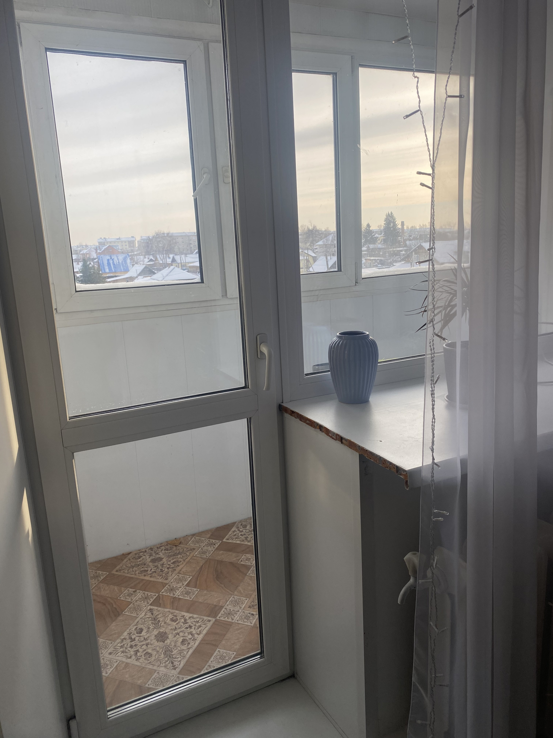 Окна- пластик, балкон полностью стекленный.