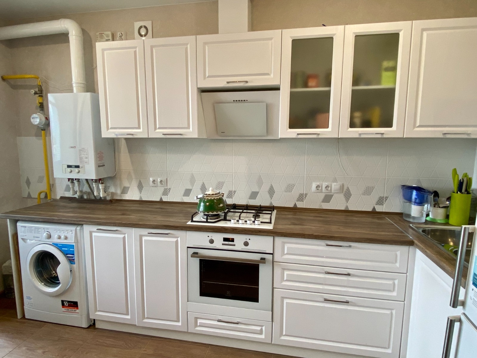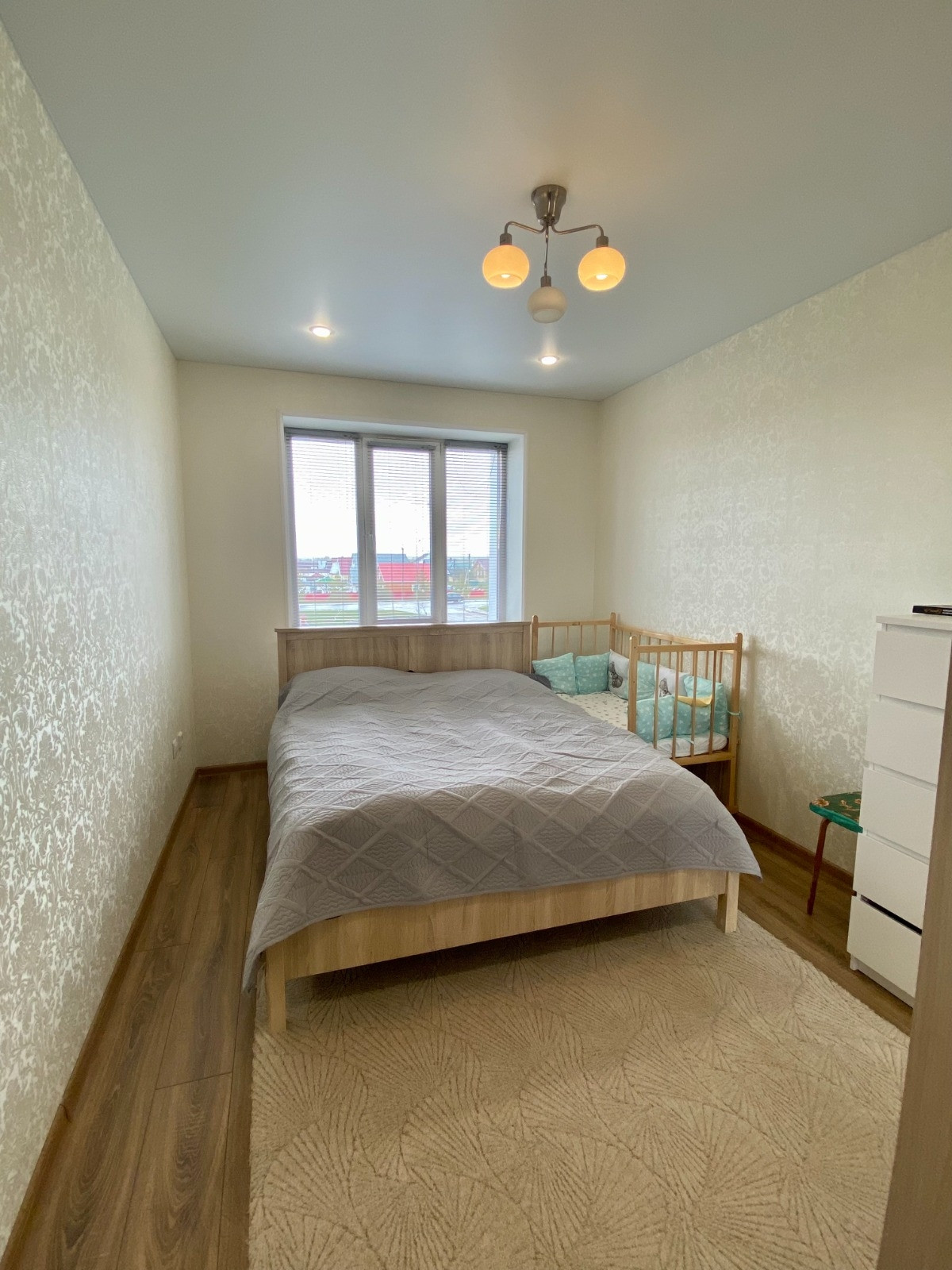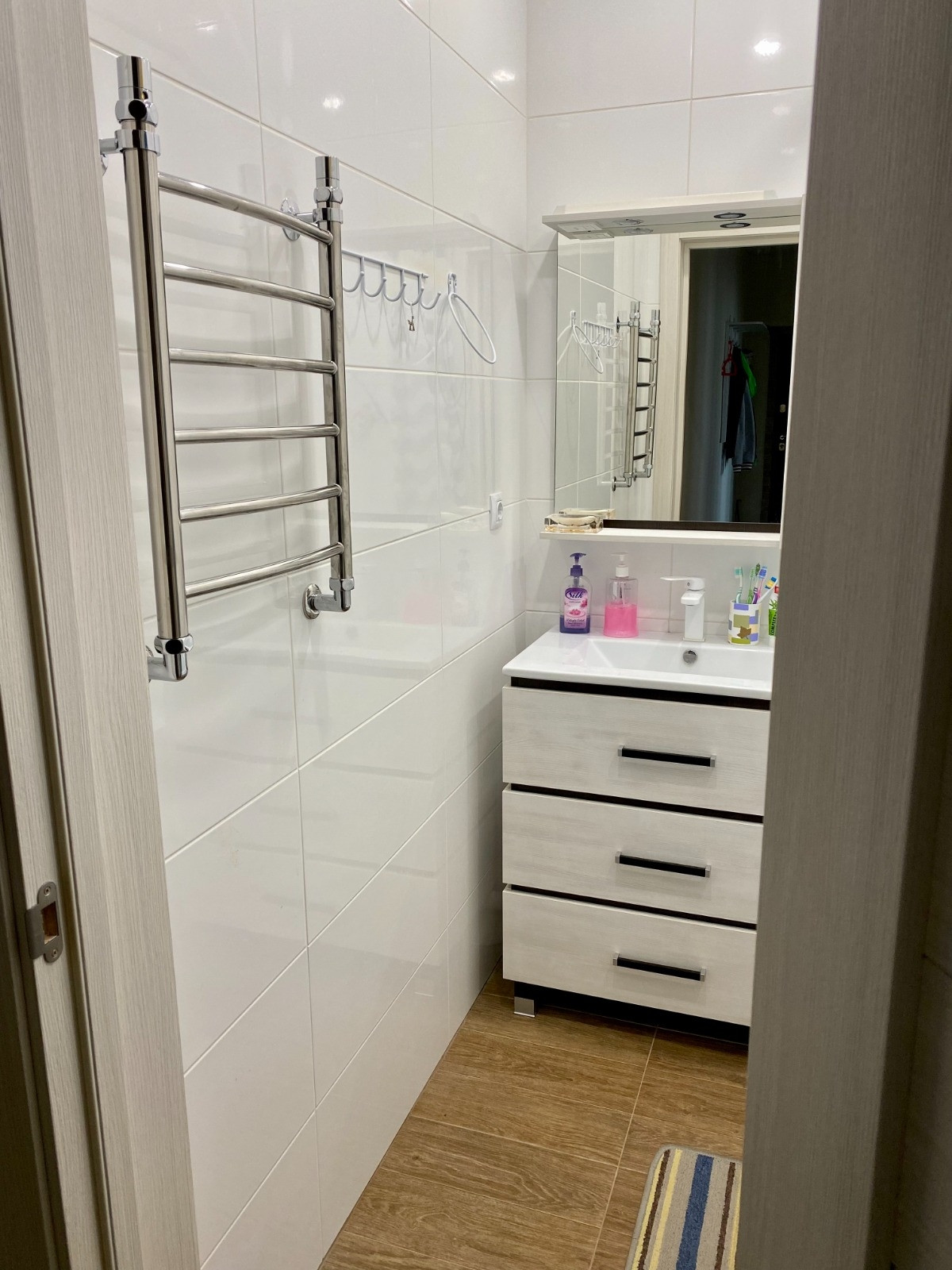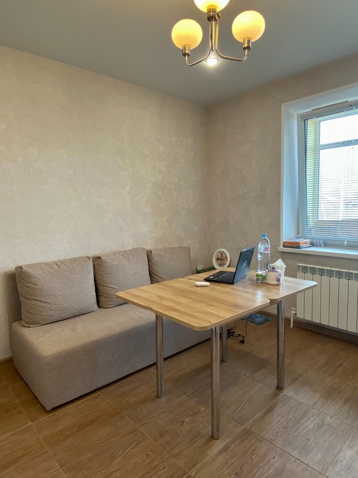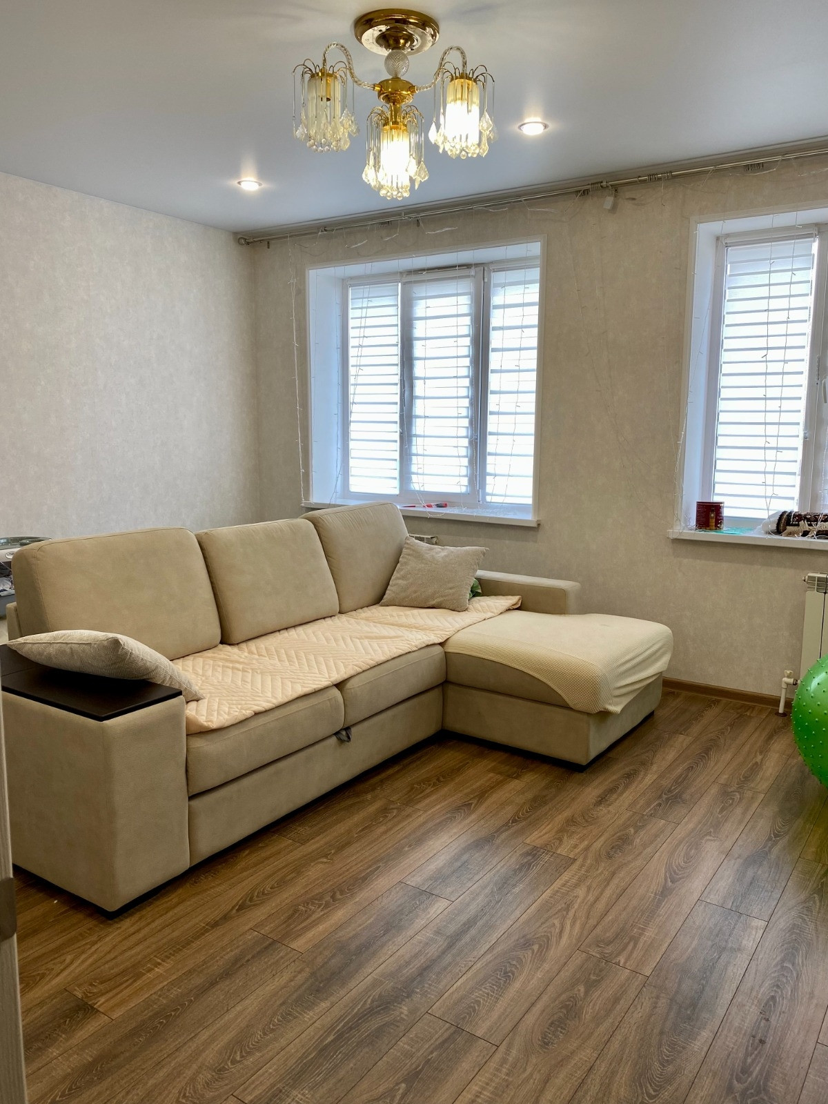 В зале и спальне покрытие пола ламинат, в остальных комнатах, включая балкон, напольная плитка. Теплые полы с регулированием в коридоре, кухне и ванной. В квартире проведено индивидуальное отопление с двухконтурным котлом. На радиаторах установлены регуляторы тепла. Балкон покрашен, теплый, с подшивным потолком, свое освещение.