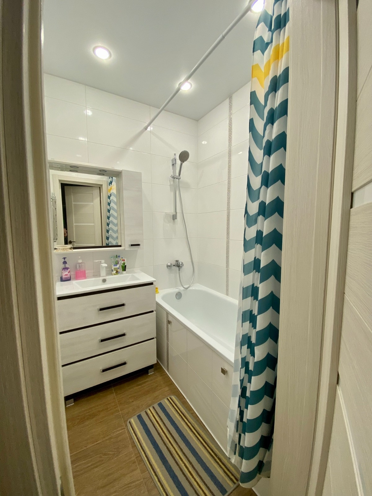 Санузел раздельный. В ванной комнате установлена акриловая ванная, в туалете проведены трубы для установки водонагревателя. Окна комнат и балкона пластиковые, входная дверь металлическая. Потолки во всех комнатах натяжные с точечным освещением.