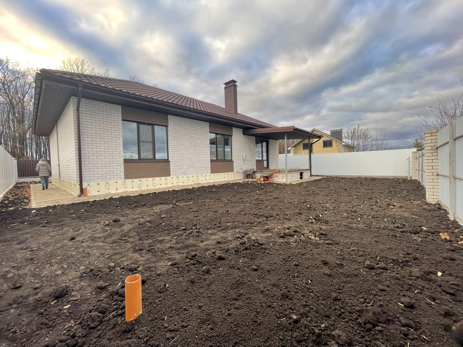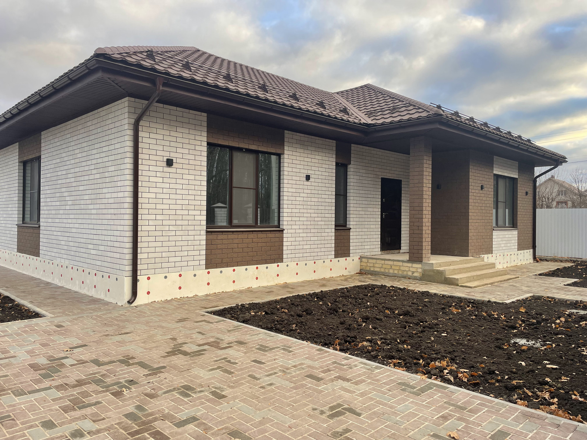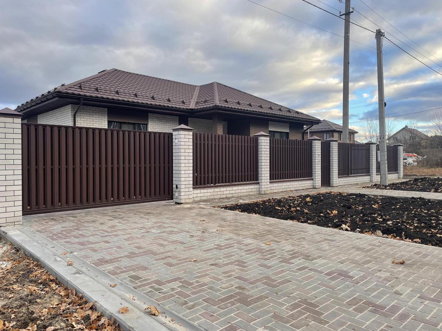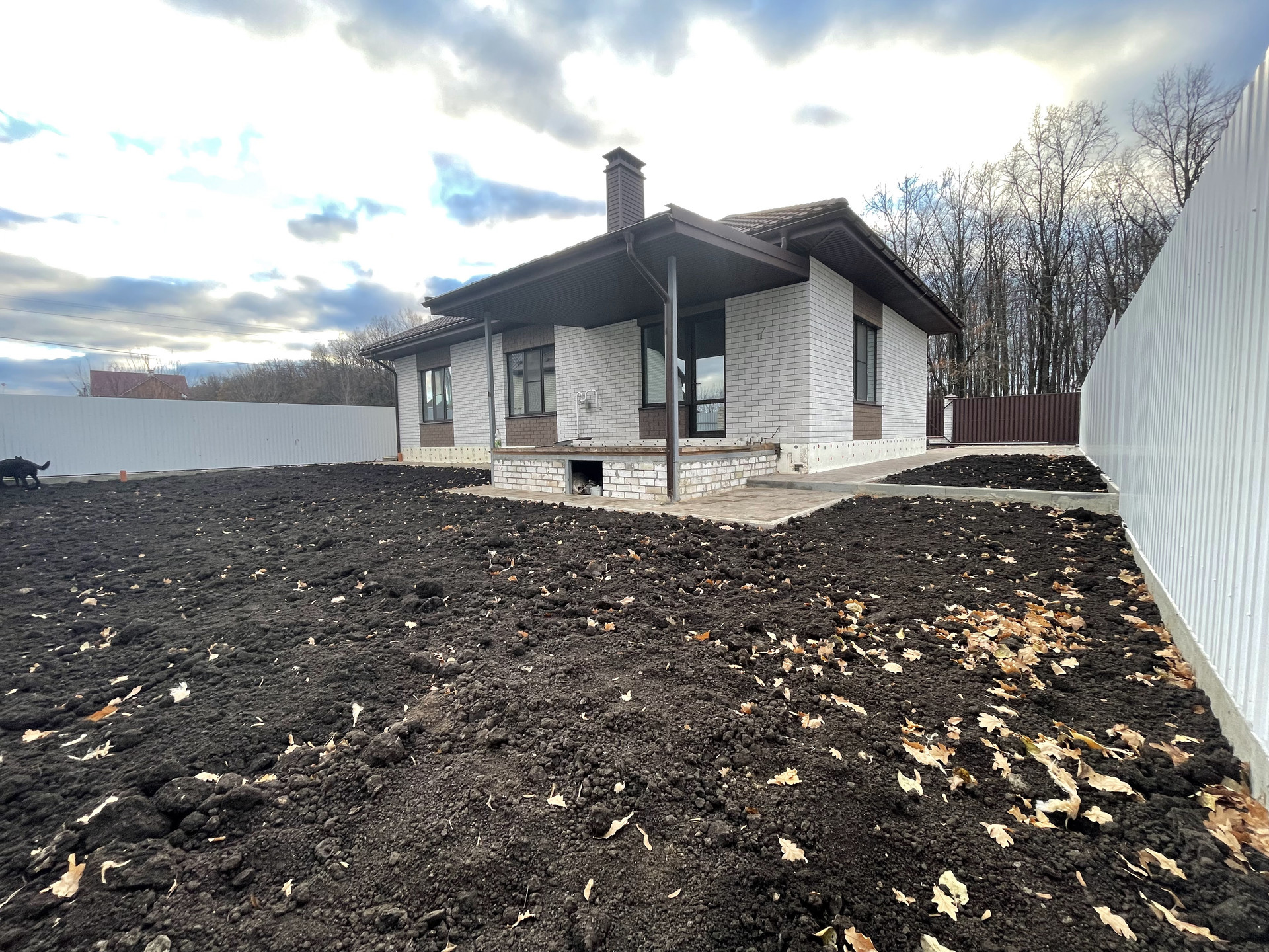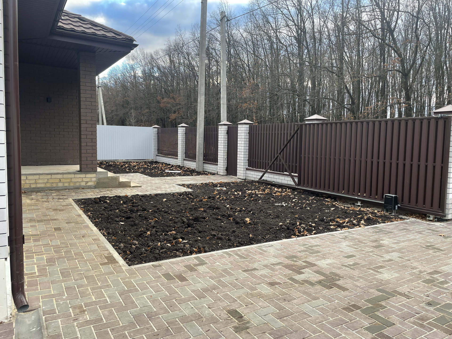 Сделано благоустройство территории: отсыпка черноземом, отмостка, дорожки и въездная группа залита армированным бетоном, положена тротуарная плитка 60мм. Сток ливневых вод с кровли и дорожек организован в отдельную ливневую канализацию. Территория огорожена забором на армированном ленточном фундаменте, из металлопрофиля (фасад кирпичные столбы и Евроштакетник). Установлены откатные ворота с автоматической системой открытия DoorHan, входная калитка с возможностью подключения видеодомофона.