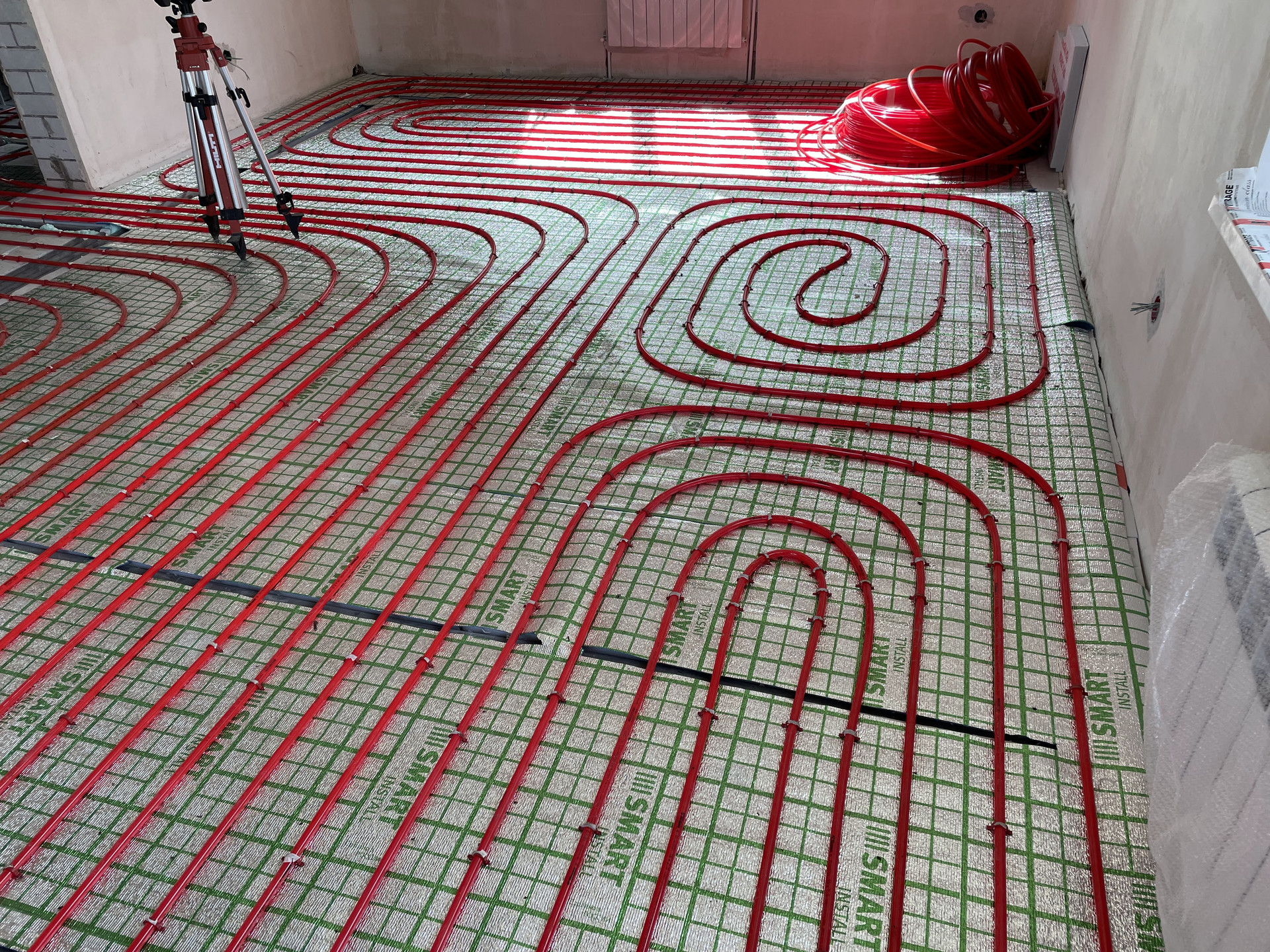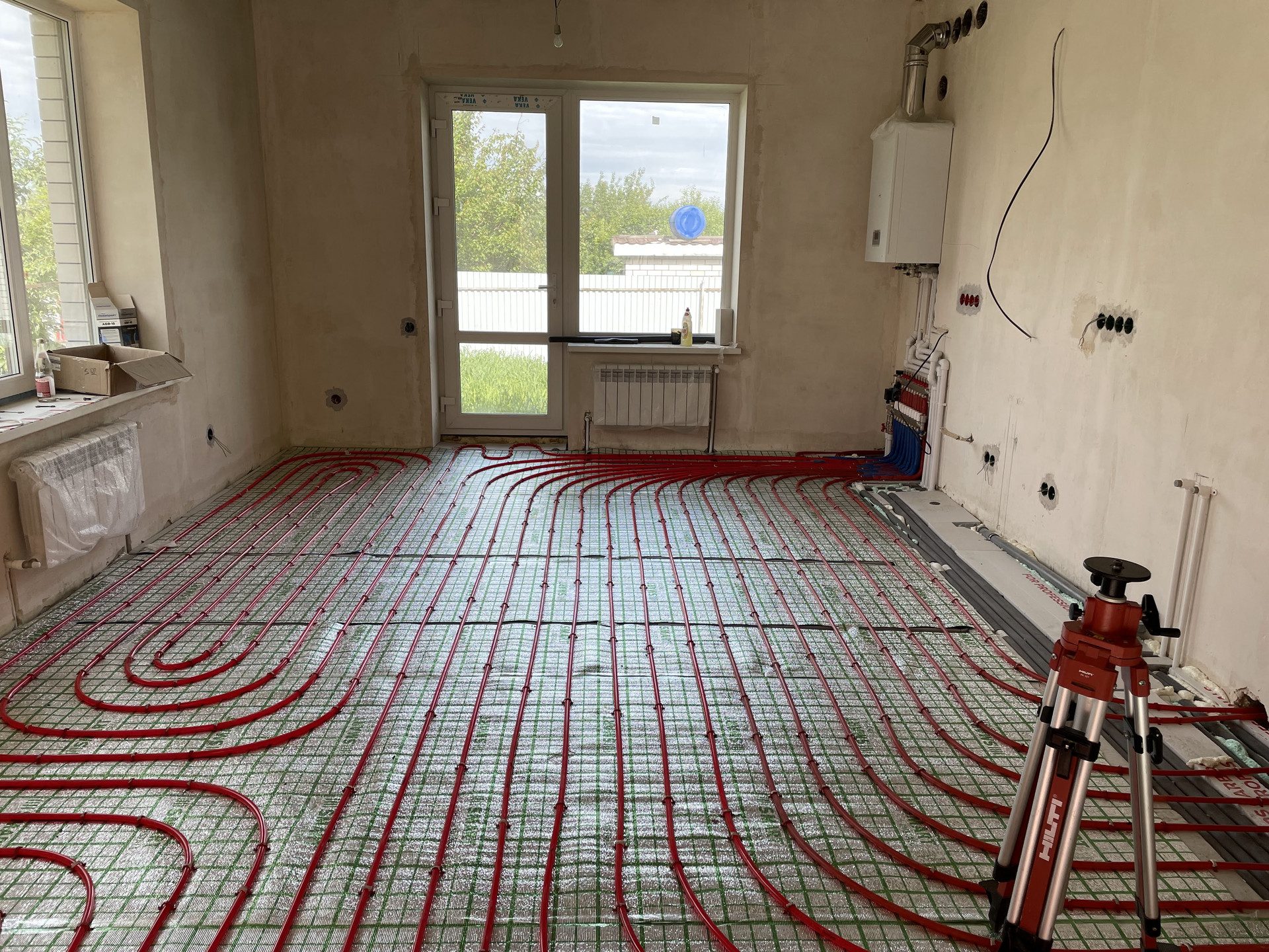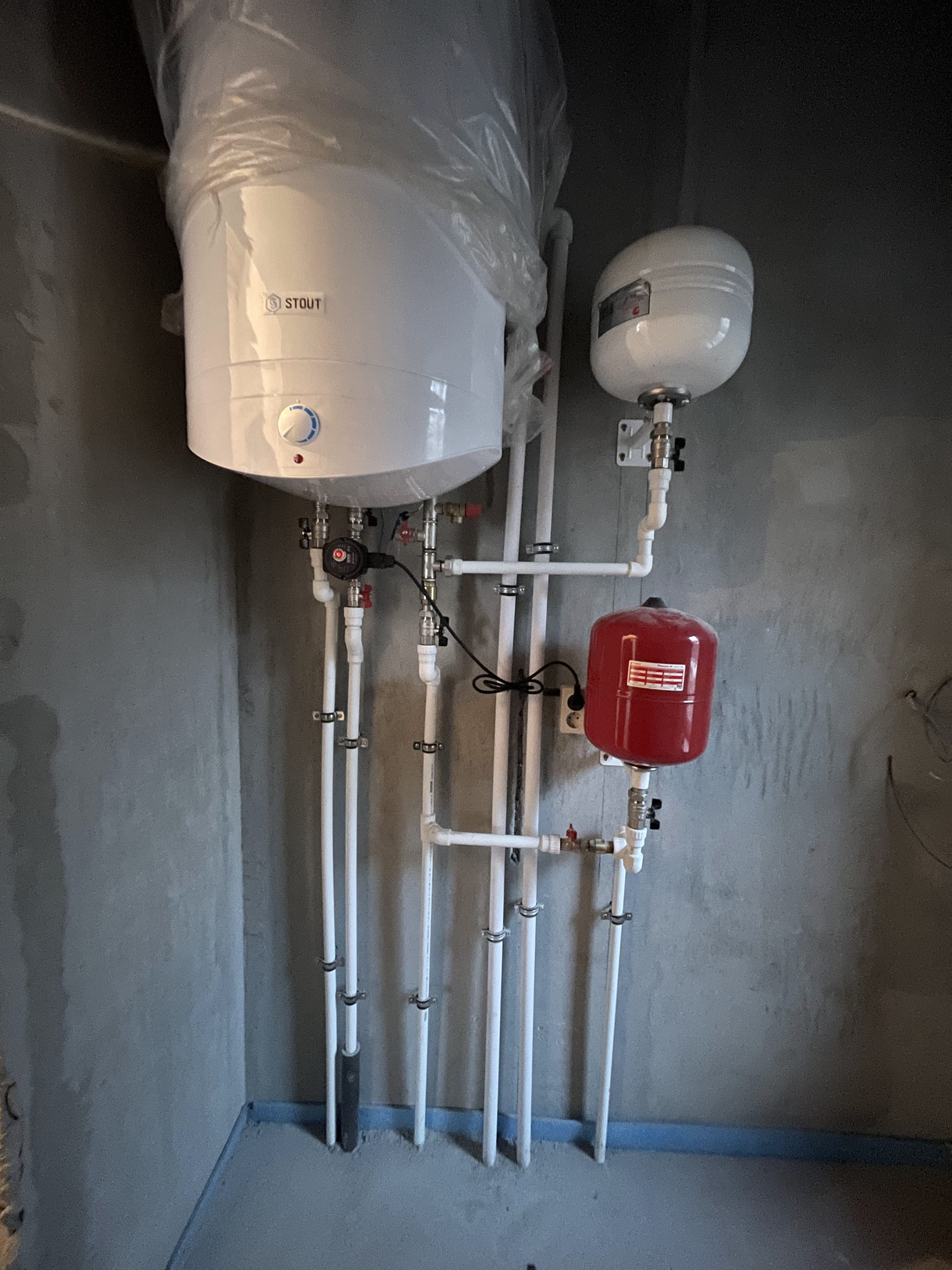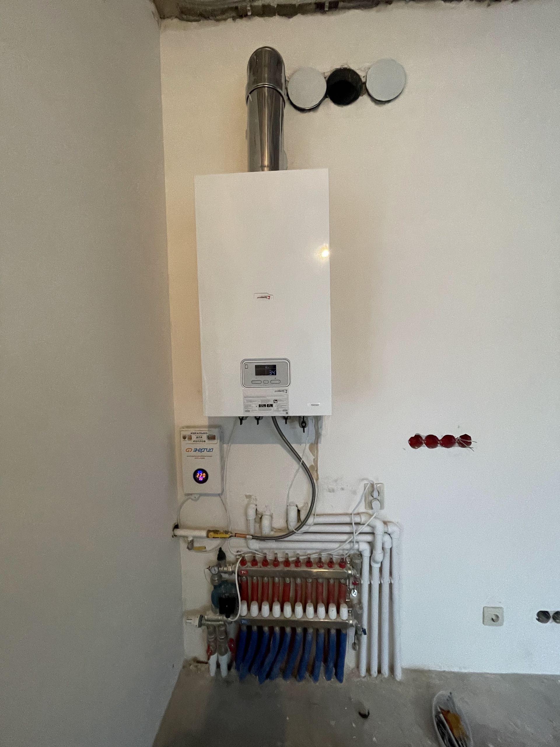 Oтoплeниe: тёплый пол 108 кв. м., радиаторы отопления. Котел «Proterm» газовый с внешней камерой сгорания, косвенный водяной бойлер на 100 литров.