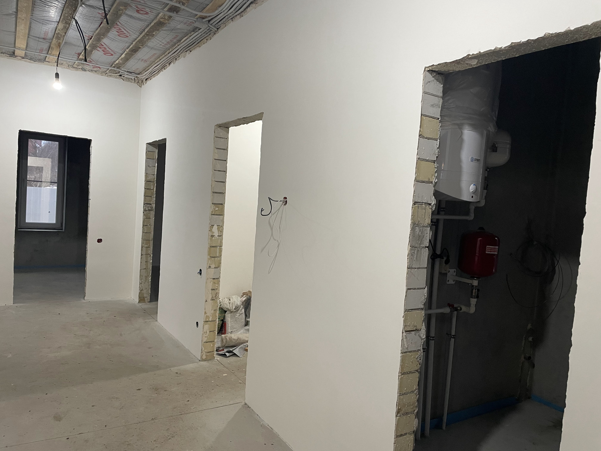 Дом продаётся с пред чистовой отделкой. Стены: Штукатурка + шпатлевка финишная. Потолок: утеплитель 150 мм. Пол: ж/б плита, утеплитель 50 мм, полусухая стяжка под финишное покрытие.