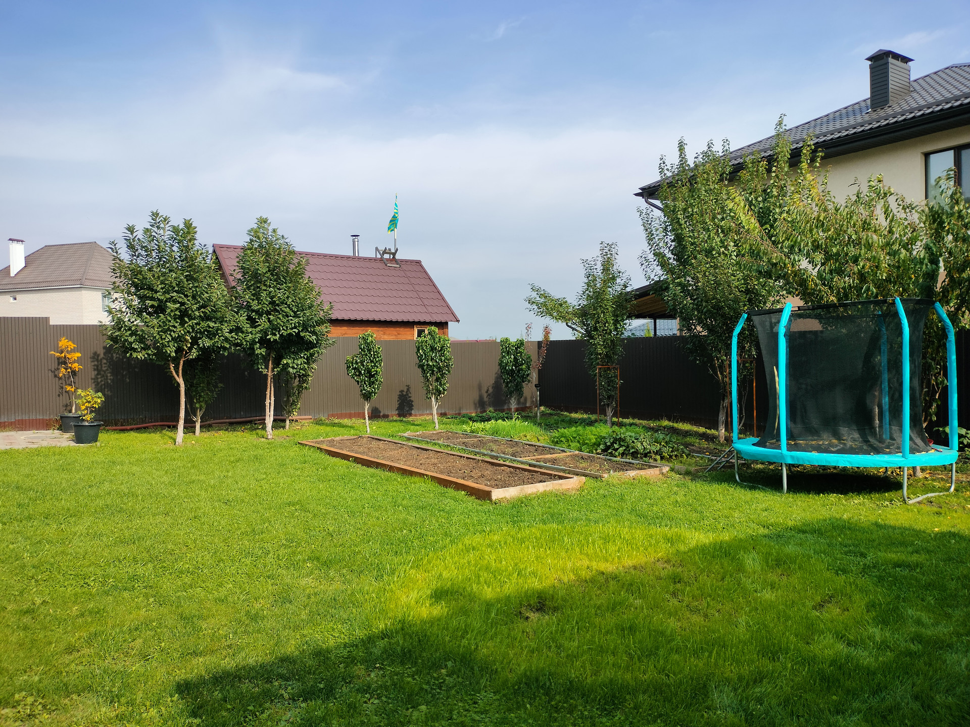 Высажены молодые деревья и кустарники: 3 яблони, 5 груш, 2 абрикоса, 2 вишни, черешня, слива, смородина, крыжовник, малина, жимолость, ежевика, клубника, виноград, плетистая роза.
