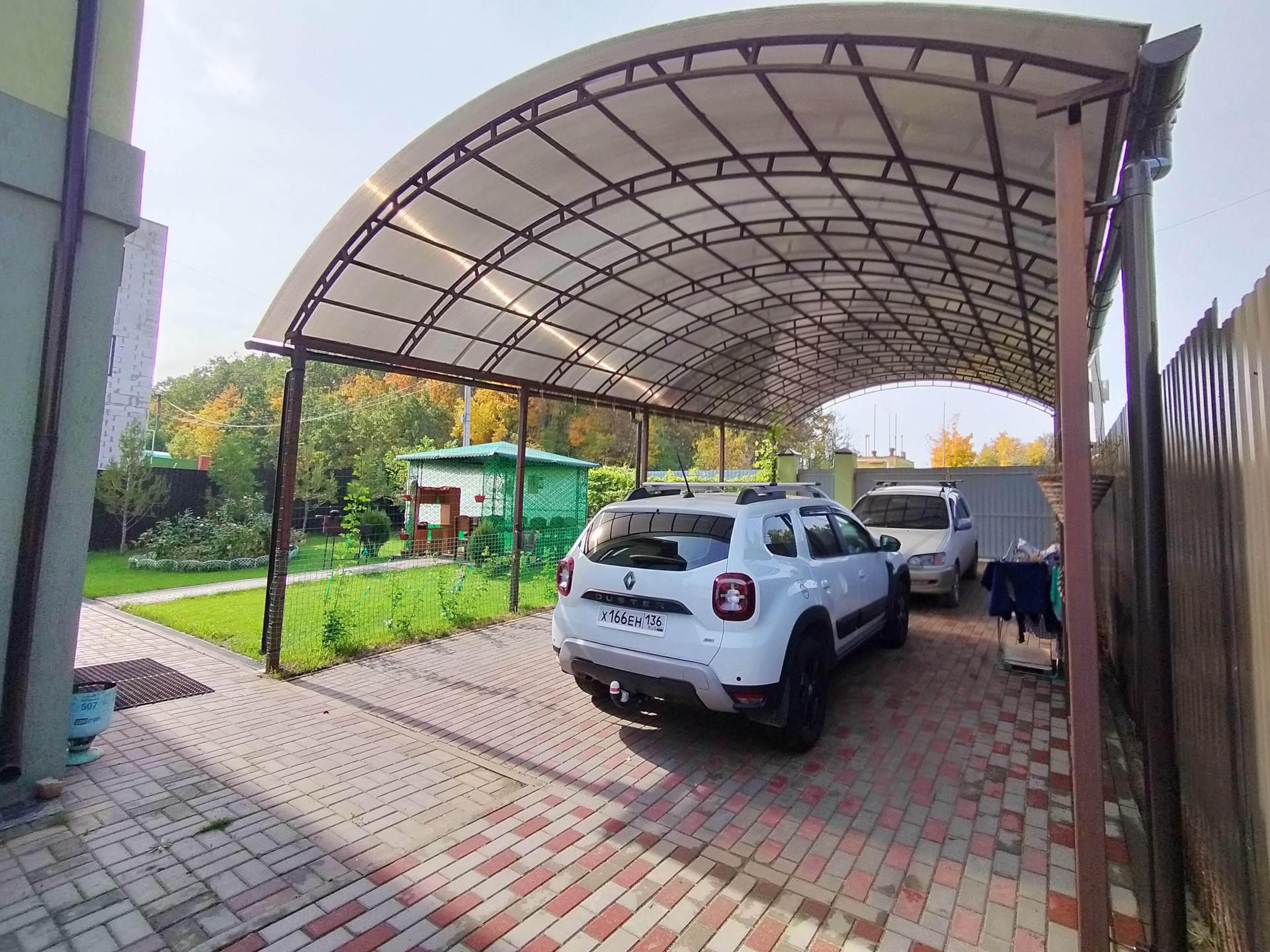 Высокий навес (проходит газель) на две машины.