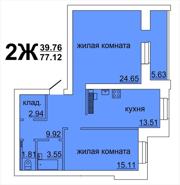 Общая площадь 70.7 кв.м. Площадь гостиной - 24.3 кв.м., спальня - 15.1 кв.м., кухня - 13.2 кв.м., коридор - 9.92 кв.м., ванная комната - 3.55 кв.м., с/у - 1.81 кв.м., кладовка - 2.94 кв.м., лоджия - 5.63 кв.м.