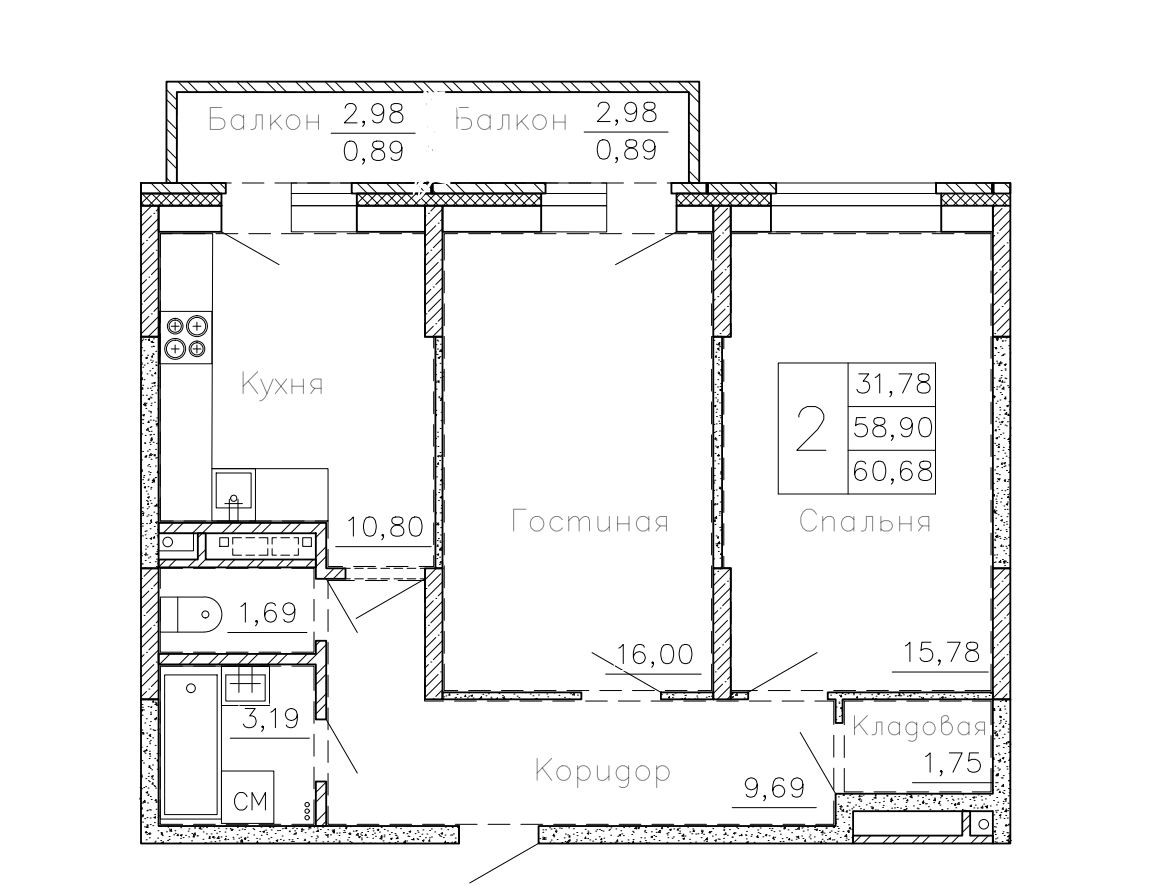 Общая площадь 60.68 м2
