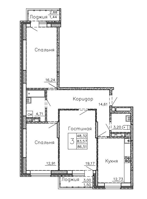 Общая площадь 86.51 м2
