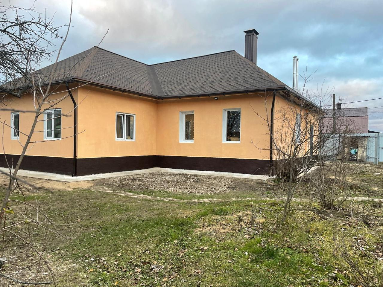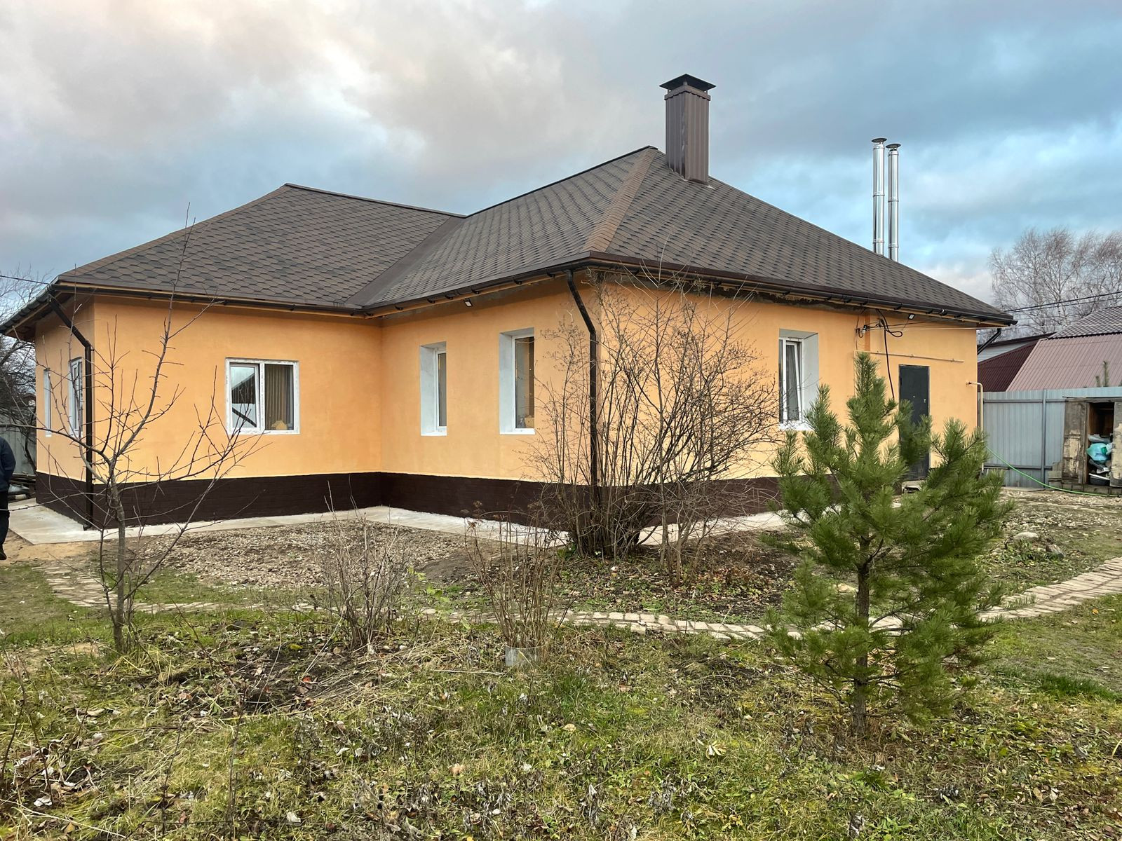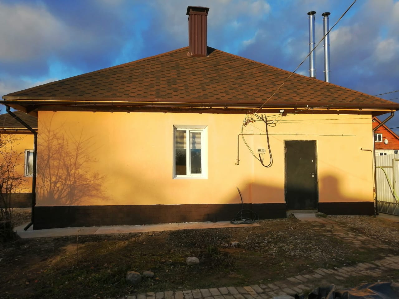 Дом построен из пеноблоков, утеплен, снаружи отштукатурен и окрашен, на свайно-ленточном фундаменте, глубиной 1,5 м. Крыша покрыта мягкой кровлей. Пристроен гараж на одно машиноместо площадью 29 кв.м. с выходом из дома.