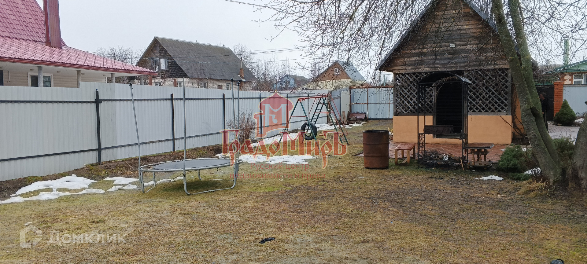 -Игровая зона для детей с качелями и батутом.