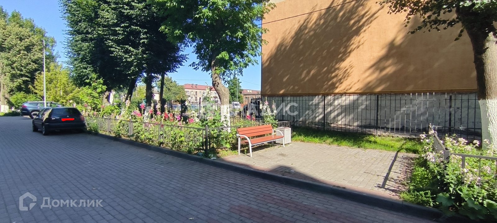 Во дворе огороженная детская площадка с безопасным покрытием, большая парковка.