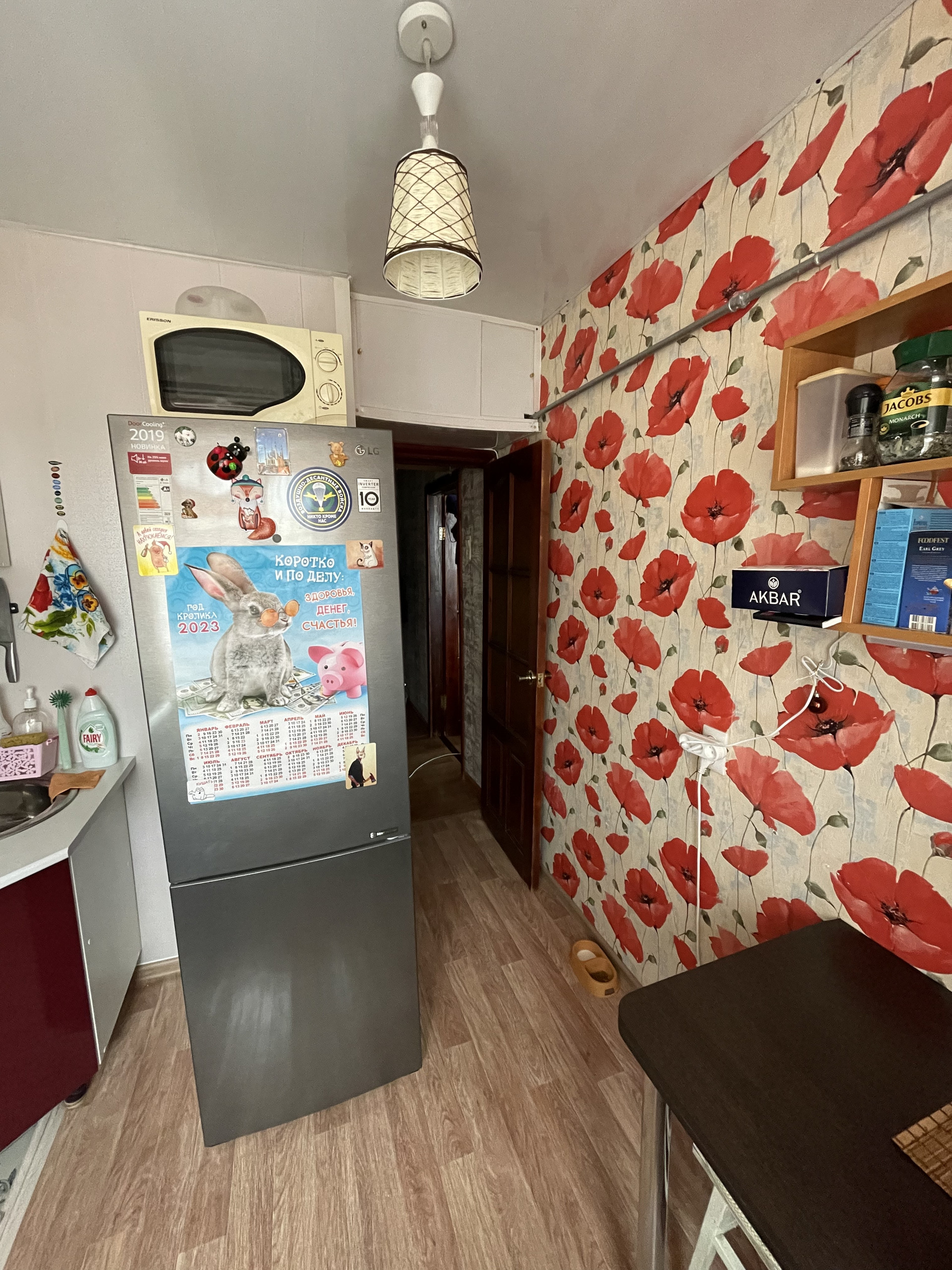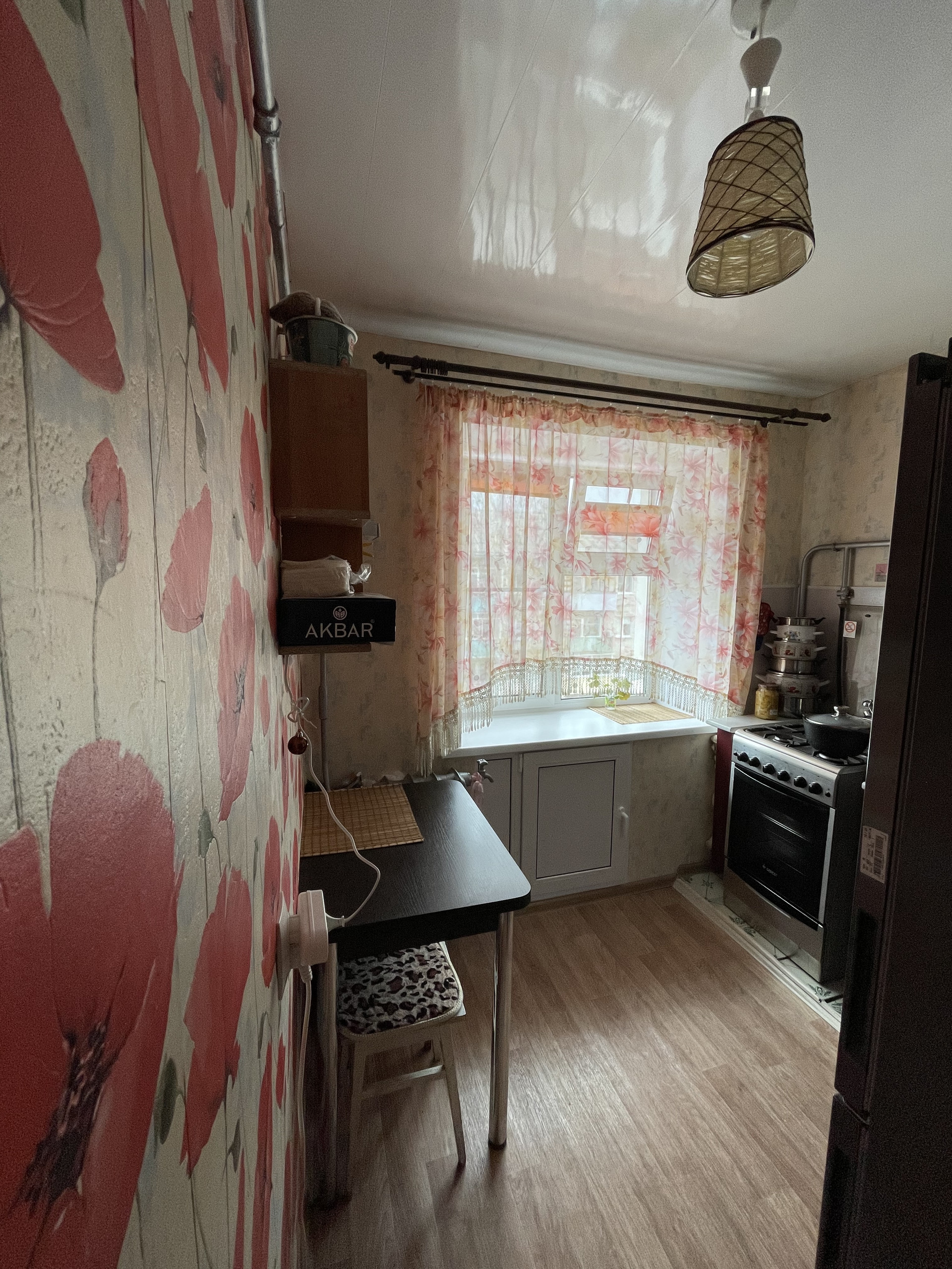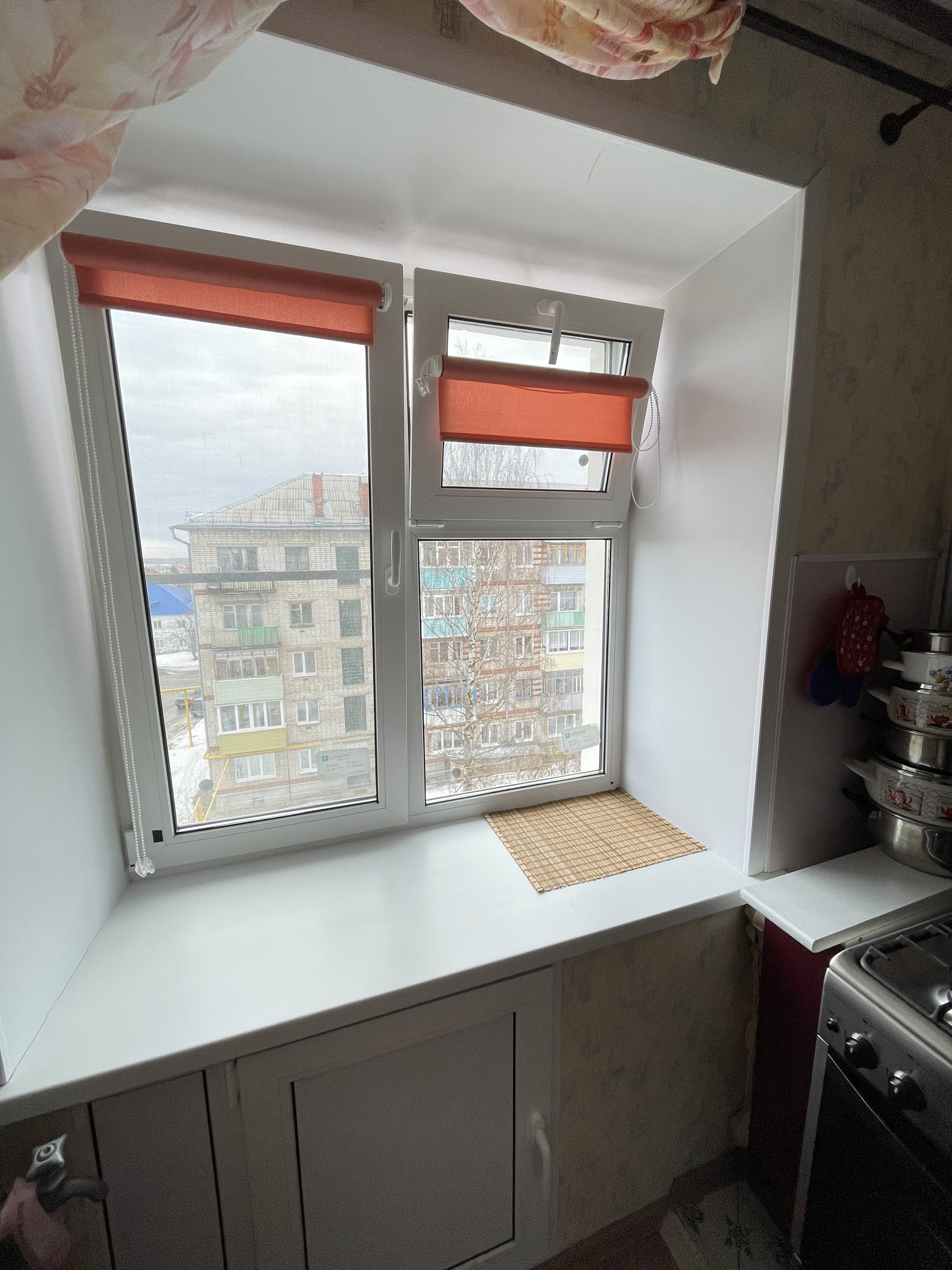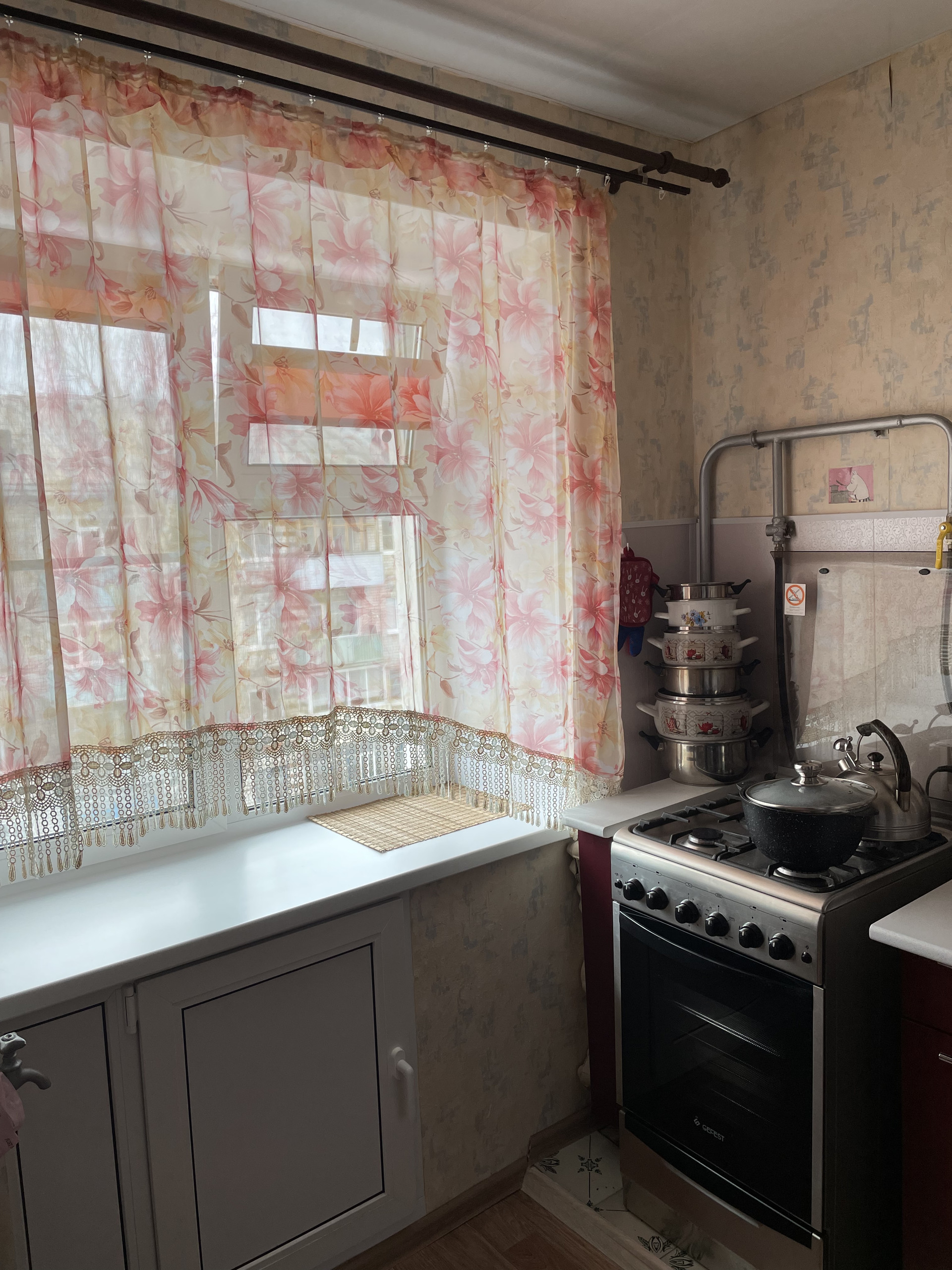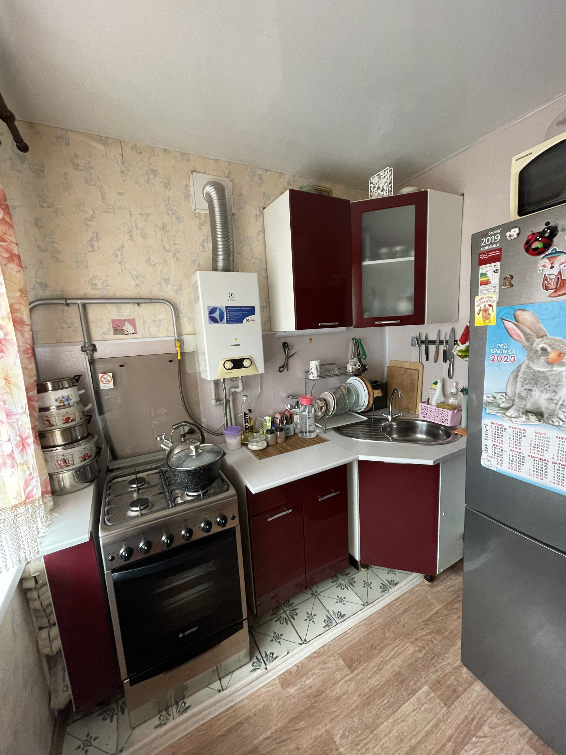 На кухне так же установлено качественное пластиковое окно, под окном так называемый «холодильник» тоже отделан пластиком. Газовая колонка современная, проблем с горячей водой нет. Кухонный гарнитур куплен в 2018 году, в хорошем состоянии, оставляем в квартире.