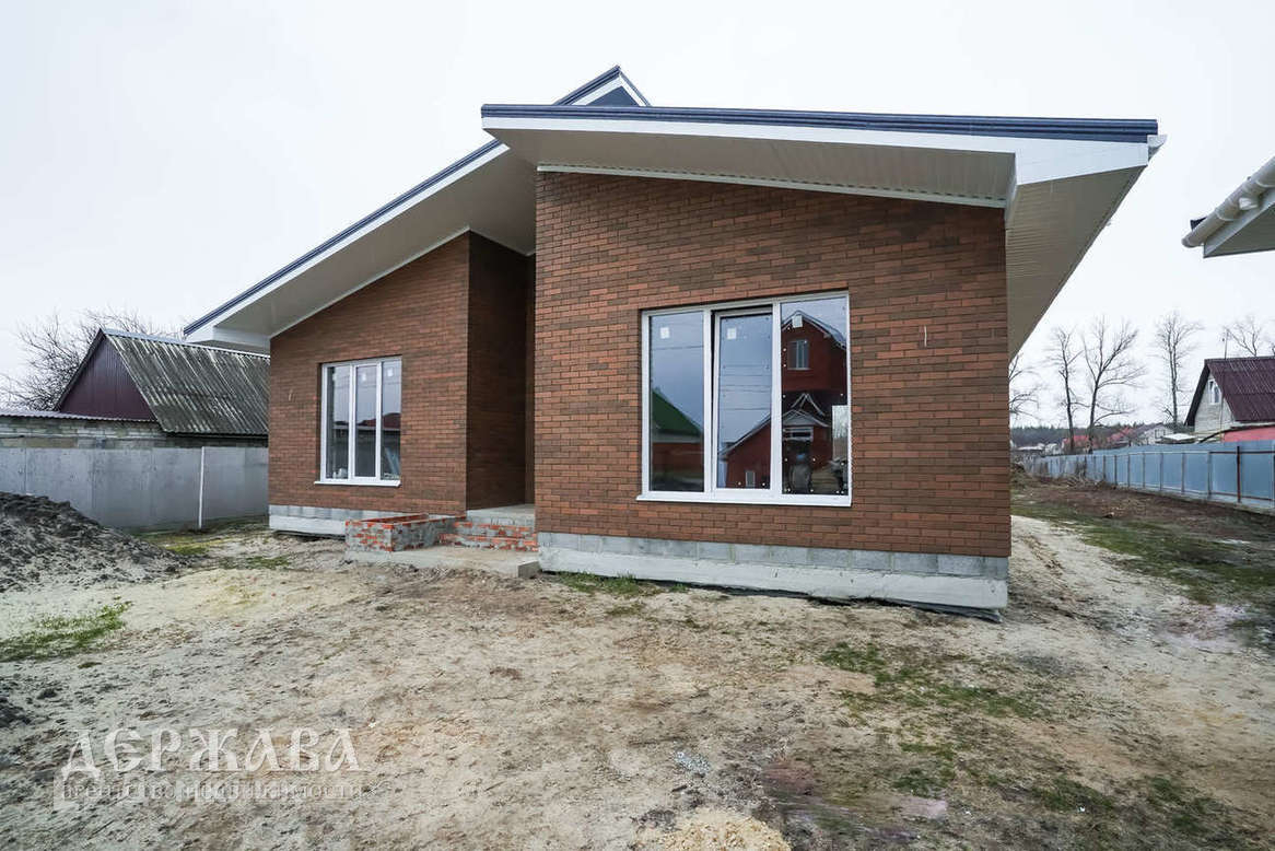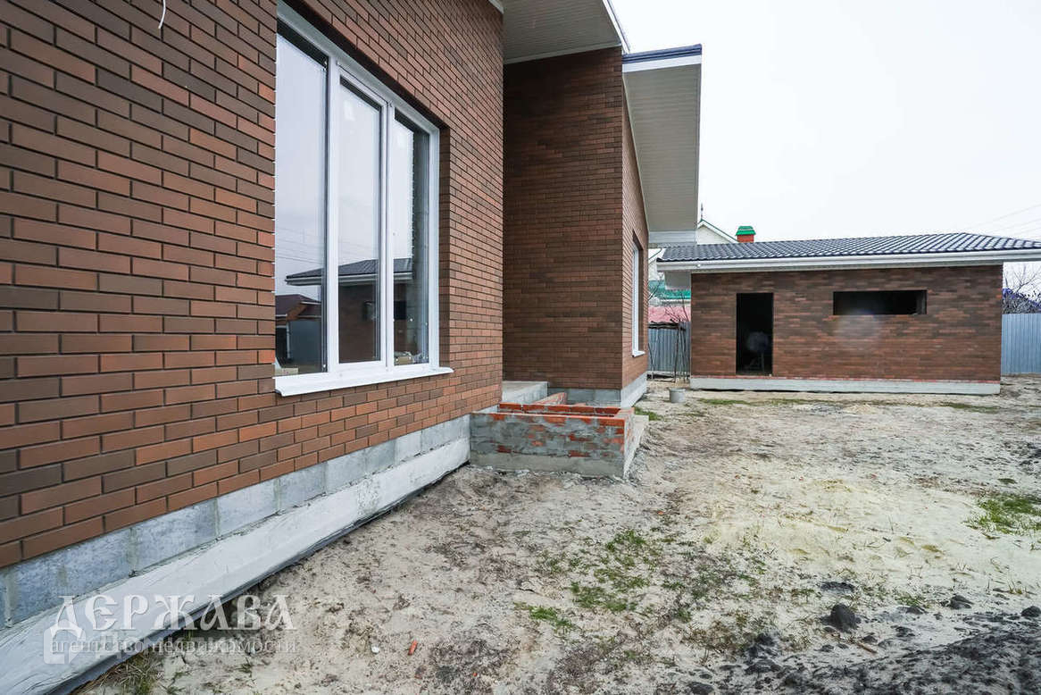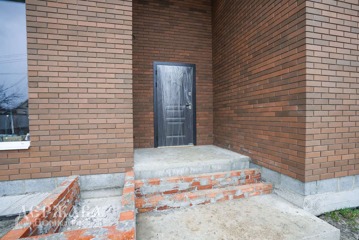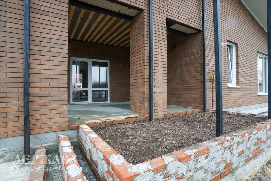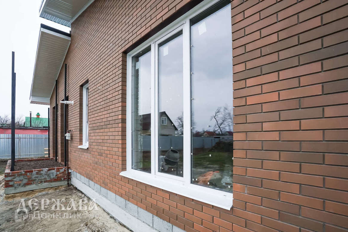 Окна -тройное остекление, отмостка по периметру дома; крыльцо перед домом с навесом, терраса с выходом из кухни-гостиной; внутри под финишную отделку: смонтирована система тёплых полов по всему дому и на террасе + радиаторы, чистовая стяжка пола, стены подготовлены под поклейку обоев, установлен двухконтурный котёл.
