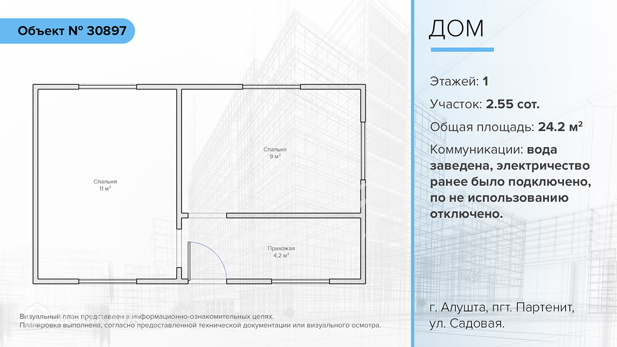 Продается небольшой жилой дом в городе Алушта, поселок городского типа Партенит, улица Садовая. Общая площадь дома: 24.2 кв.м. Дом стоит на земельном участке площадью 2,55 соток.