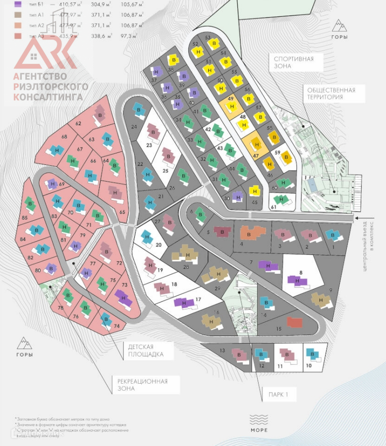 Общая площадь под инфраструктуру 1,72 га (без площади дорог, тротуаров). Две большие парковые зоны с беседками, зонами для медитаций и йоги с гамаками, горным ручьем, беседками, зонами барбекю, кострищем − расположены в теневой зоне.