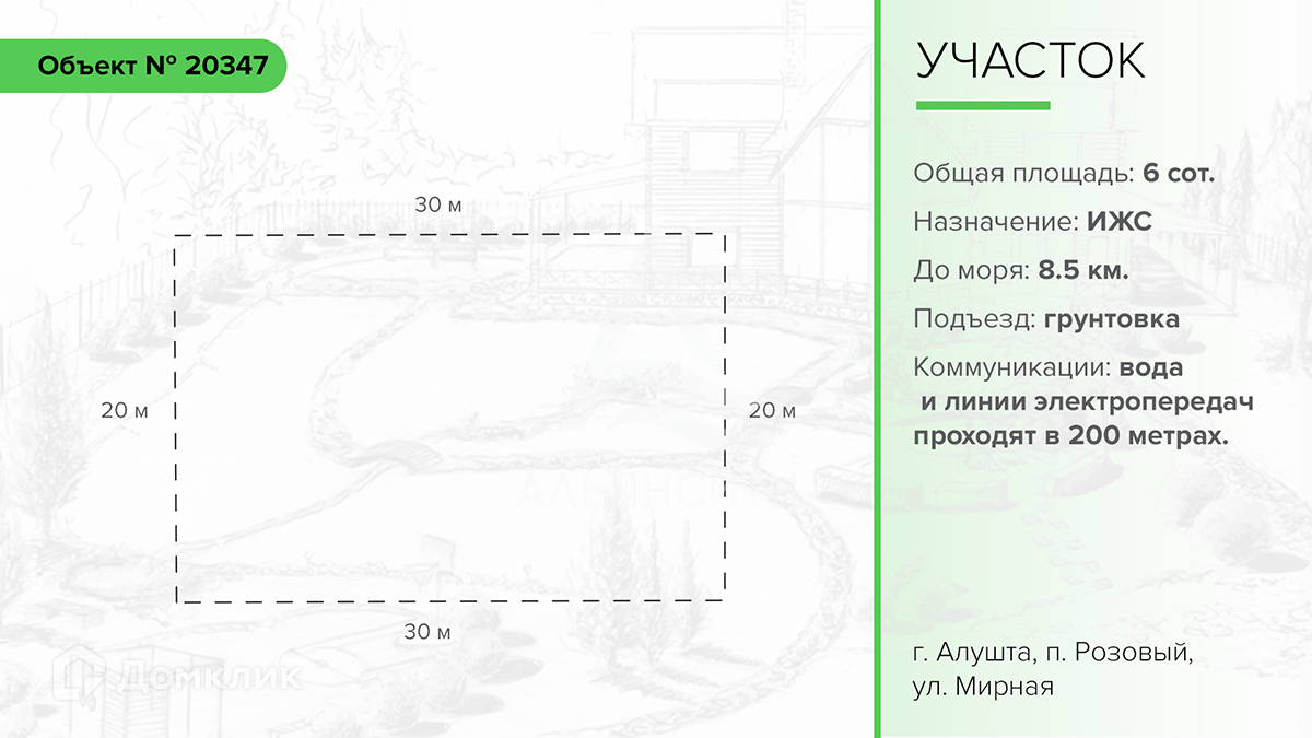 В продаже земельный участок в городе Алушта, поселок Розовый, улица Мирная. Общая площадь участка: 6 соток. Назначение: индивидуальное жилищное строительство.