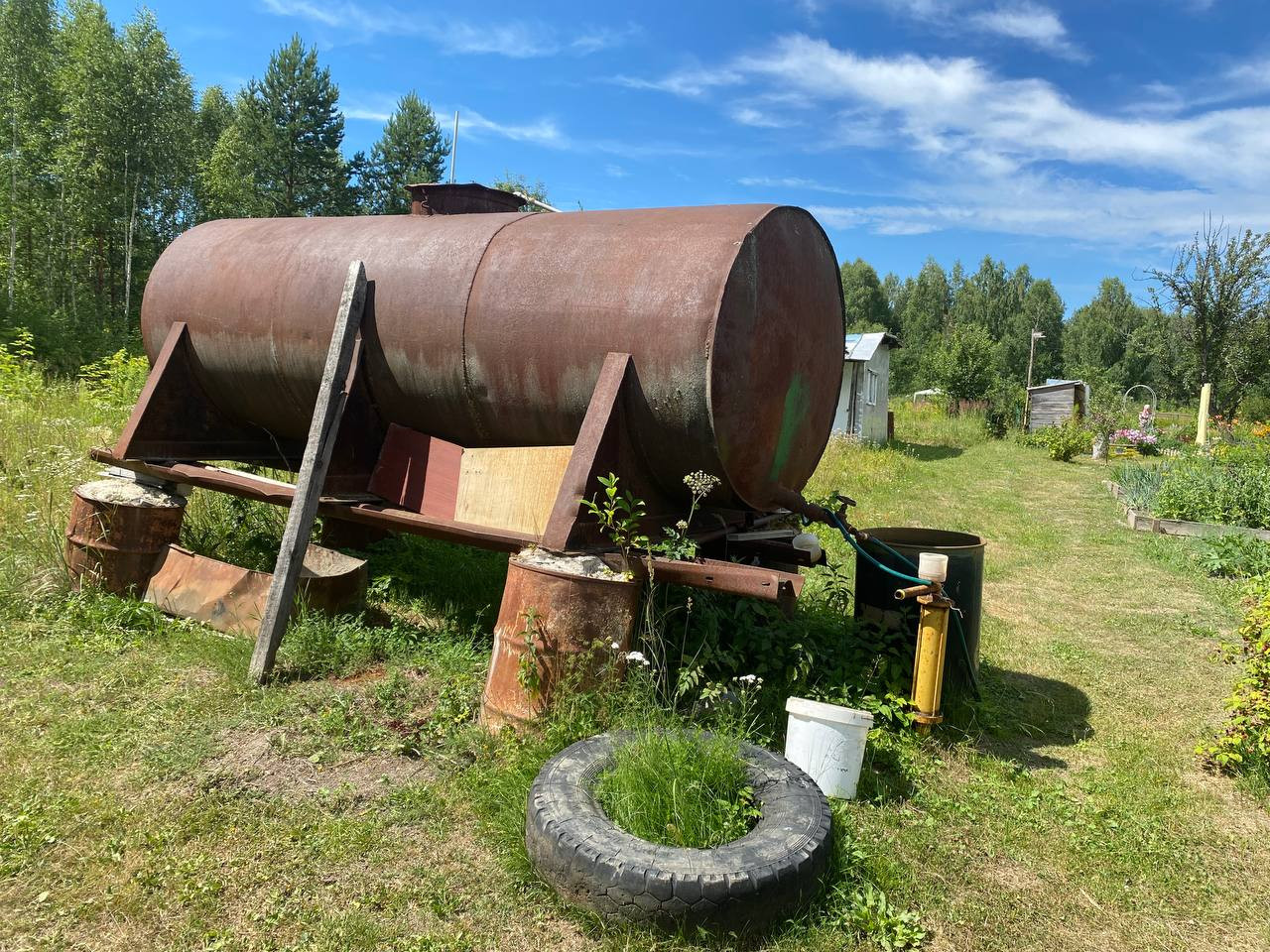 Электроснабжение - бензиновый генератор (остается новым владельцам). Вода - из скважины, а так же бак для полива (на двоих с соседями).