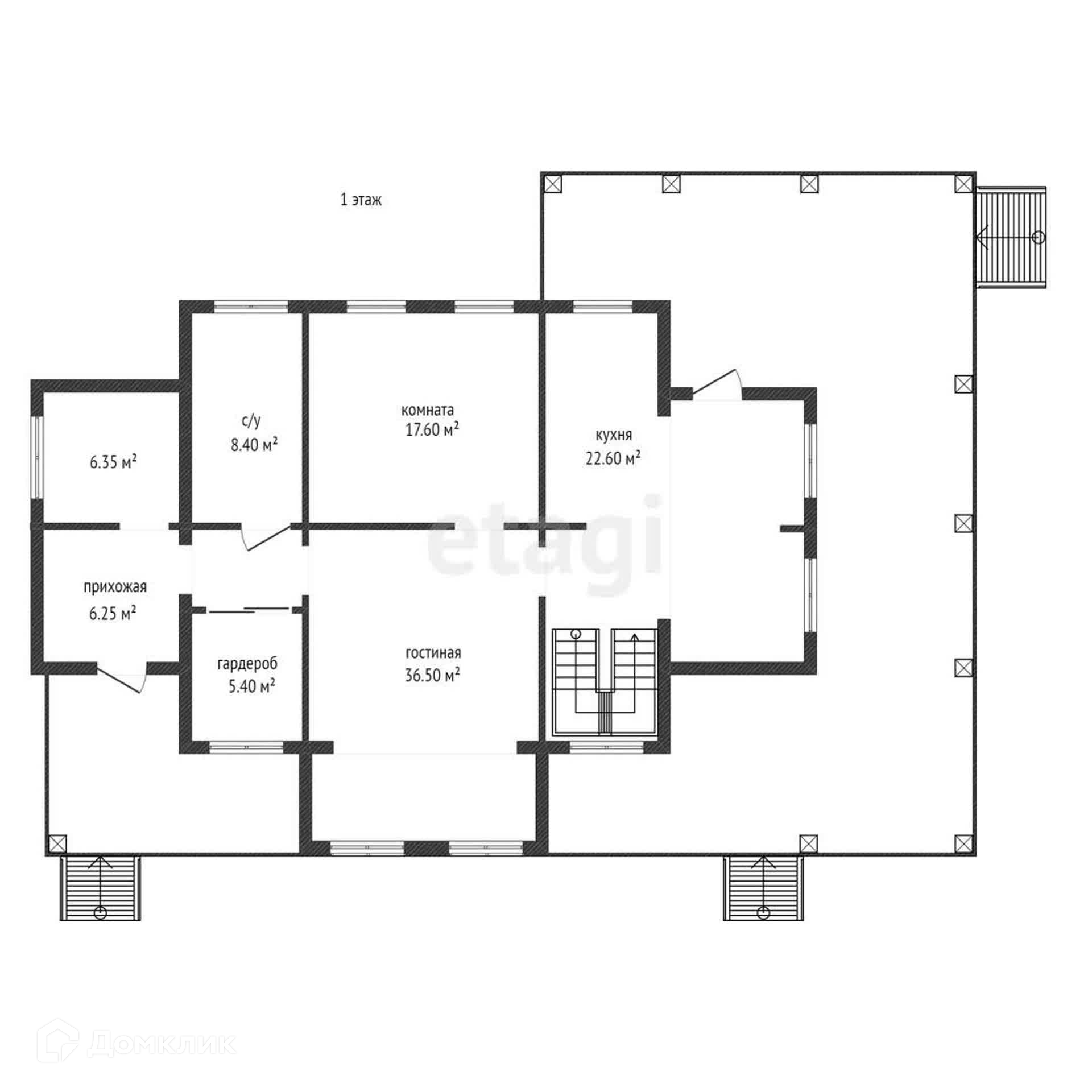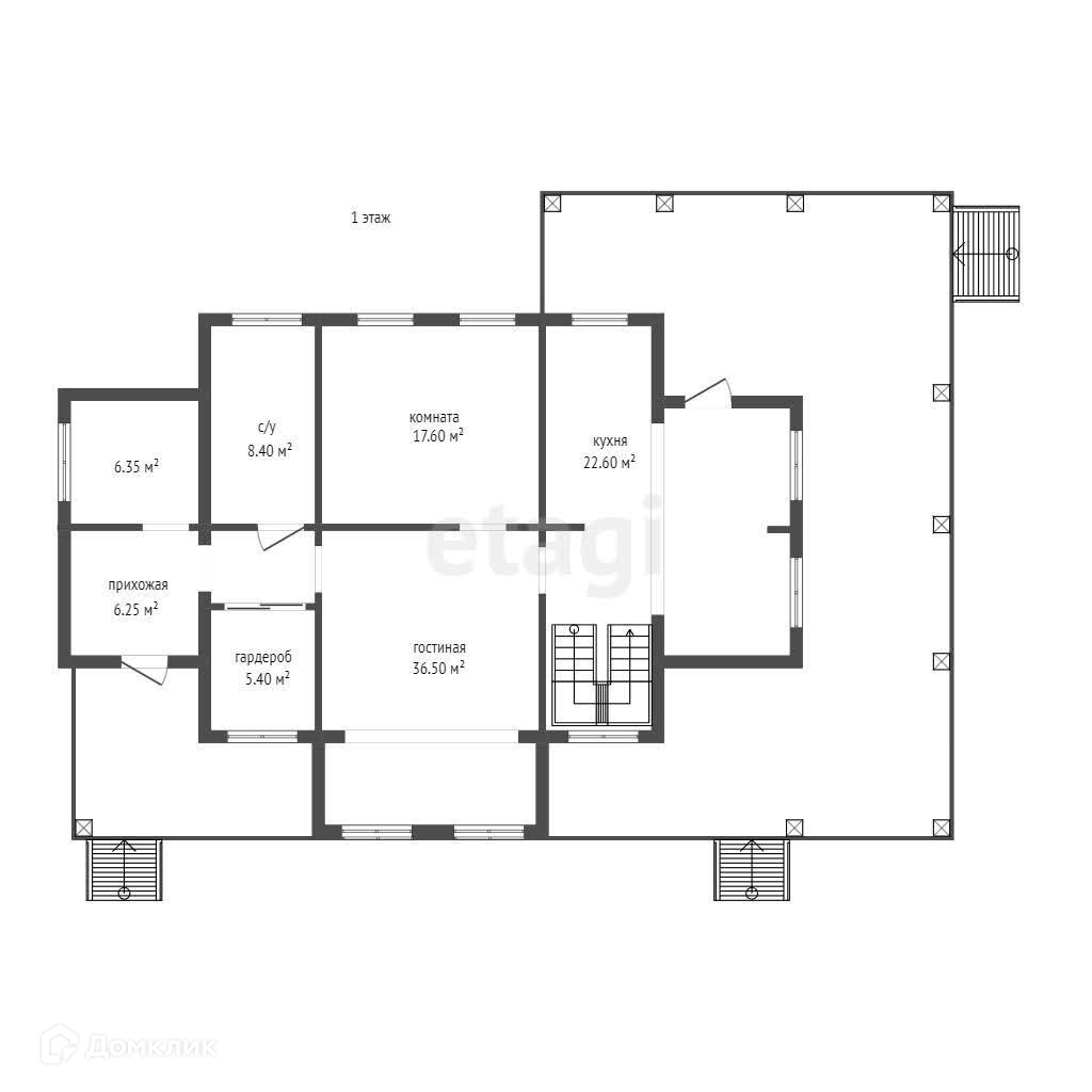 На первом этаже расположены зал со вторым светом, большая комната, которая отлично подойдет в качестве гостевой спальни, большая кухня, гардеробная, санузел и техкомната. Снаружи имеется огромная терраса, расположенная под крышей дома.