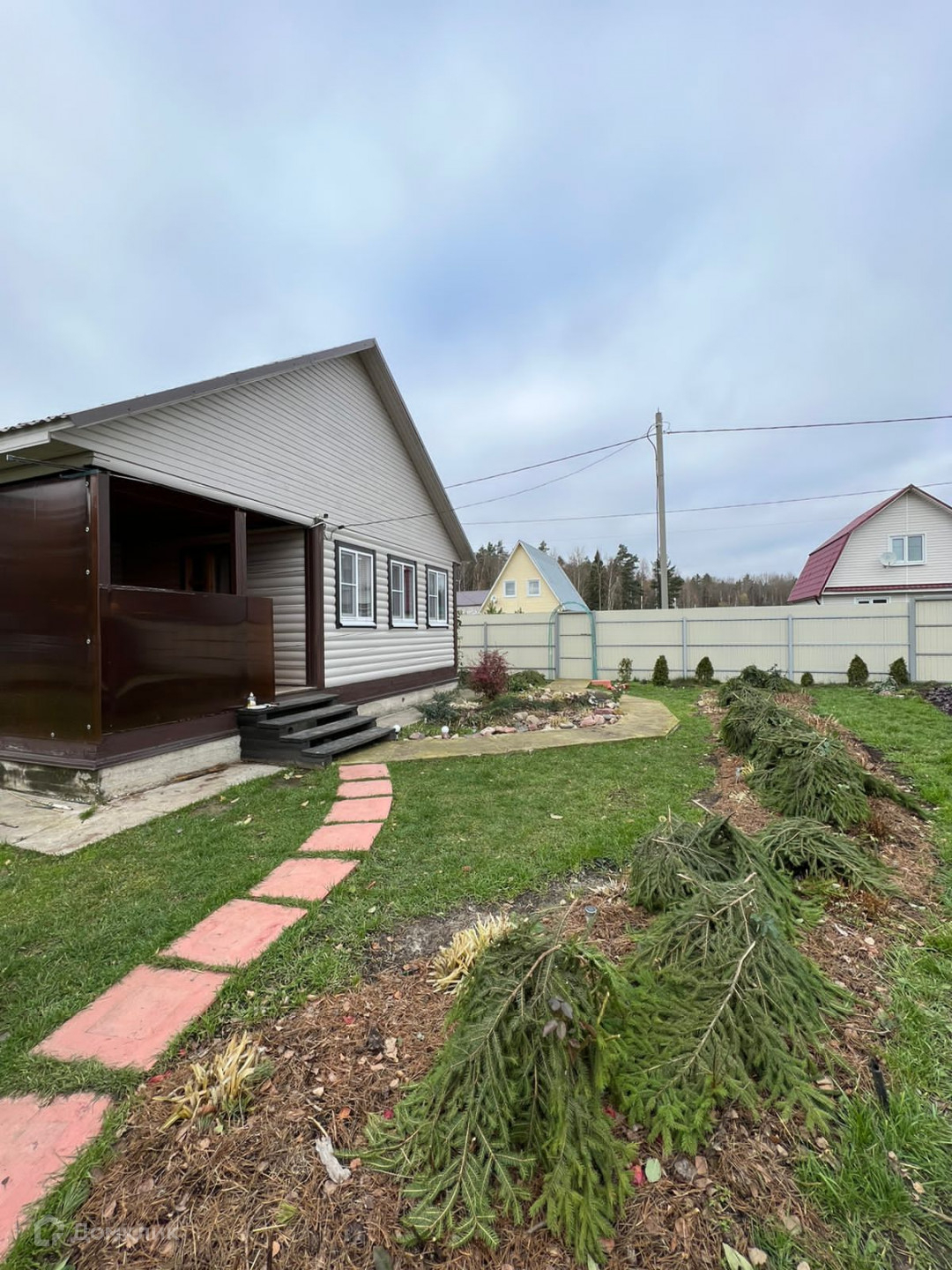Входная зона обнесена металлопрофильным забором с механическими воротами , зона парковки залита бетоном на два автомобиля.