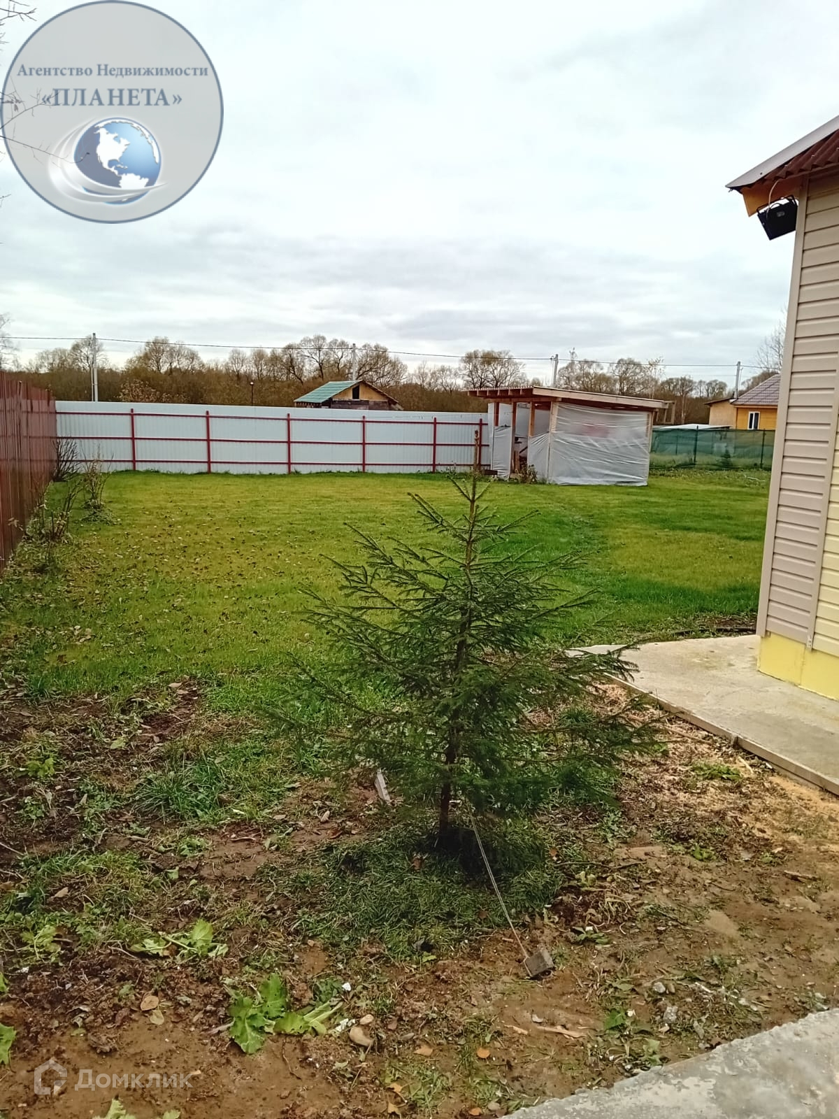 Участок ровный, правильной формы. Сделан газон. Так же на участке есть парковочное место. А сам он огорожен забором из профлиста.