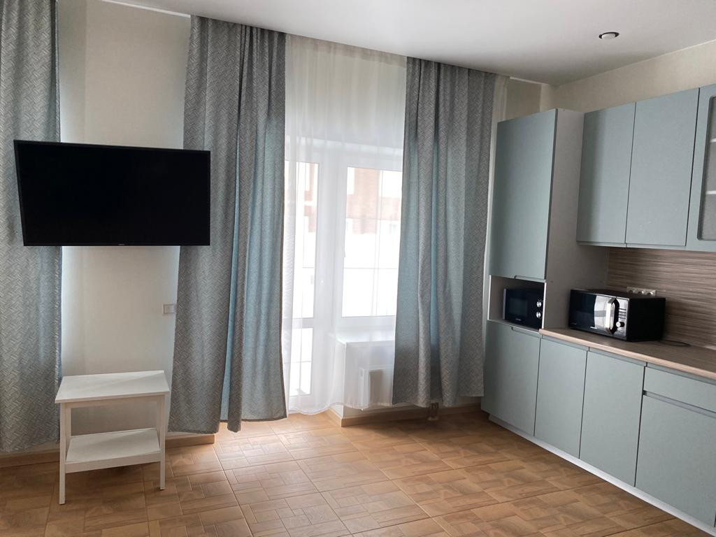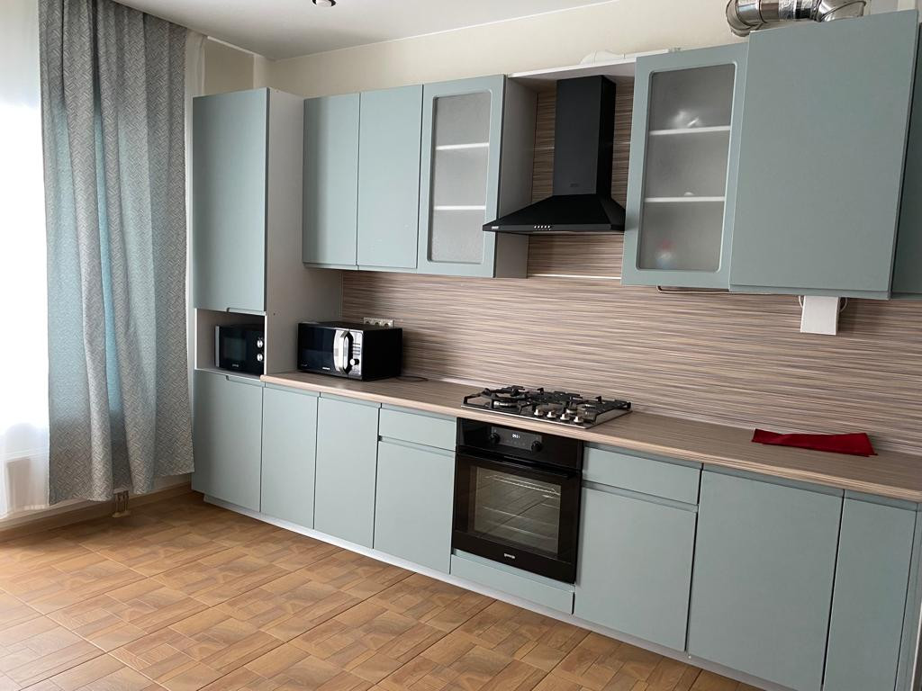 1-й этаж: санузел; коридор со шкафом; зал/большая комната, объединенная с кухней; кухня со всеми шкафами, техника имеется.