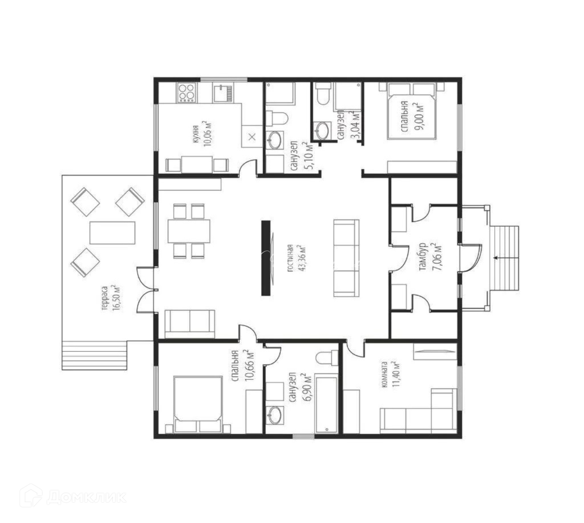Жилая: 74,5 кв.м. Гостиная 43,3 кв.м. Спальни  9/10.7/11,5 кв.м. Кухня 10 кв.м.