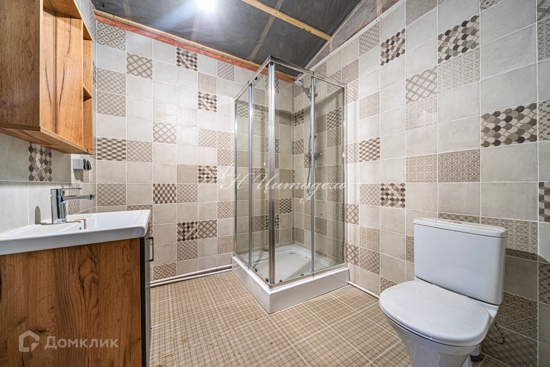 Внутренняя отделка – стены и потолок имитация бруса, пол – ламинат, плитка в ванной и туалете. Электрические теплые полы, вентиляция, сантехника в ванной комнате.