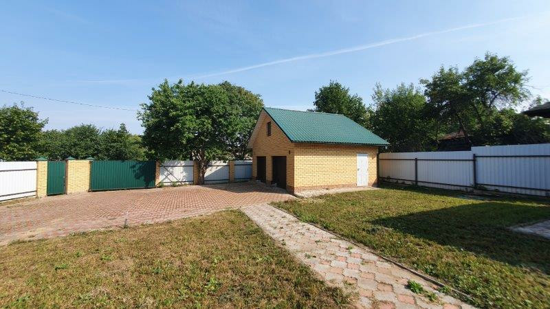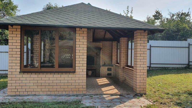 гараж 39 м2 на две машины, блочный облицован кирпичом, летняя кухня-барбекю 25 м2 с панорамными пластиковыми окнами, летняя открытая веранда.