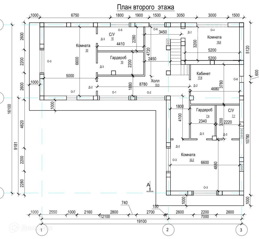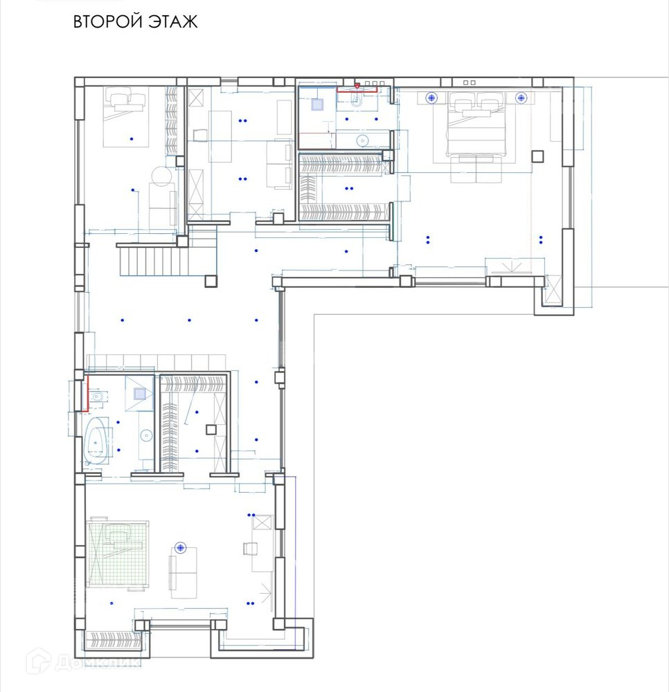 2 этаж: кабинет, три спальни с отдельными санузлами и гардеробной. Одна спальня с выходом на террасу 42 кв. м.