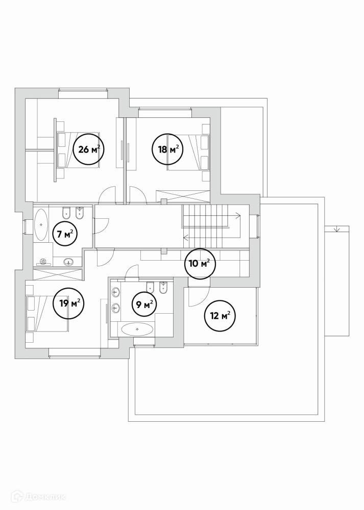 В доме предусмотрено 4 спальни. Мастер спальня 19 м² имеет собственную ванную комнату 9 м², гардеробную 10 м² и балкон. Общая площадь мастер спальни 50 м². Высокие потолки 3.3 метра и большие панорамные окна в пол 3х3 метра – отличительная особенность архитектурного стиля поселка.