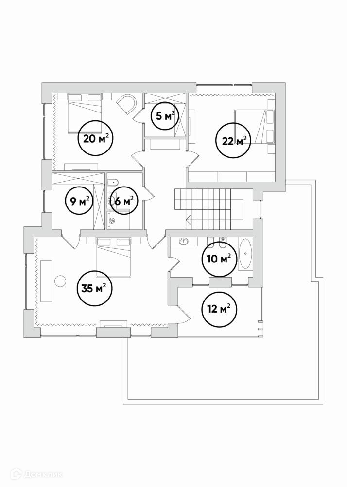 В коттедже предусмотрено 4 спальни. Мастер спальня 35 м² имеет собственную ванную комнату 10 м², гардеробную и балкон. Общая площадь мастер спальни – 63 м². Высокие потолки 3.3 метра и большие панорамные окна в пол 3х3 метра – отличительная особенность архитектурного стиля поселка.