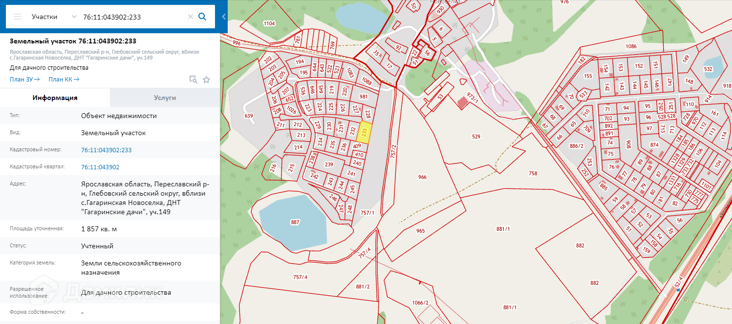 Продается земельный участок общей площадью 1857 кв. м, по адресу: Ярославская область, Переславский р-н,  Глебовский сельский округ, вблизи с. Гагаринская Новоселка, ДНТ "Гагаринские дачи", участок № 149. Участок расположен в Переславском районе в самом начале Ярославской области, в 95 км от МКАД по Ярославскому шоссе (М8).Кадастровый номер: 76:11:043902:233. Коммуникации: электричество - по границам участка.Один взрослый собственник, без обременений и ограничений, полная стоимость в договоре.