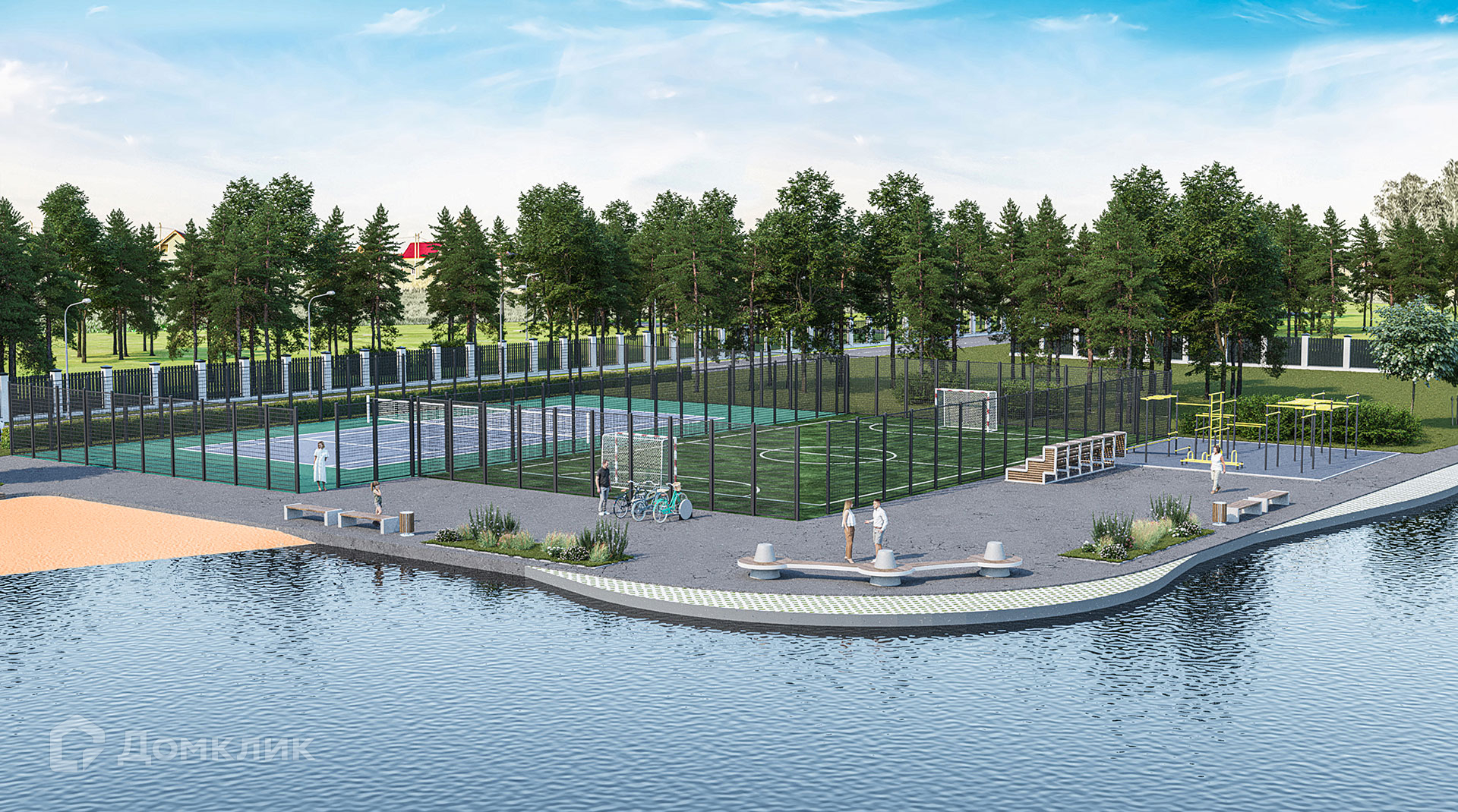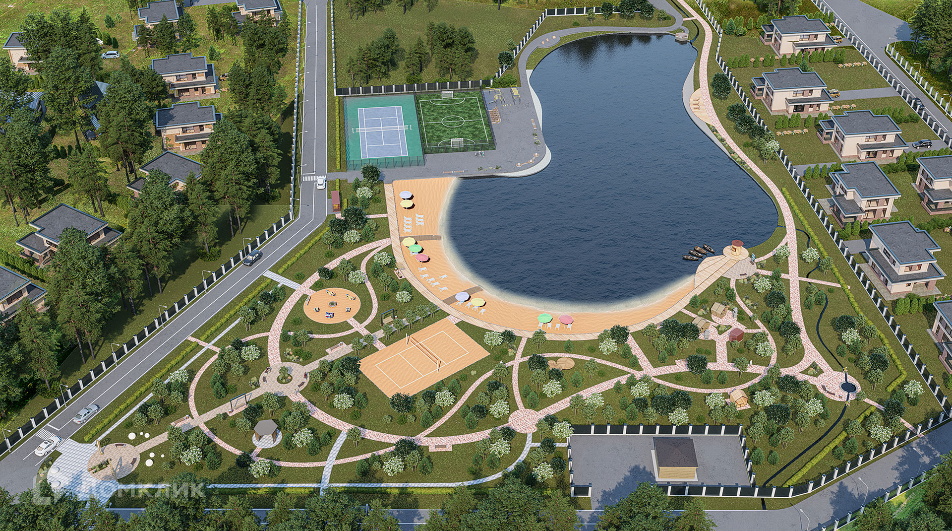 дорога, Охрана, Уборка дорог, Вывоз мусора. Теннисный корт. Природа: озеро, река, заповедник. Рядом находится Загородный клуб с собственным рестораном, конным клубом, зоопарком, веревочным парком, большой детской площадкой, рыбалкой! Также мы занимаемся строительством домов и готовы вам построить любой проект на этом участке.