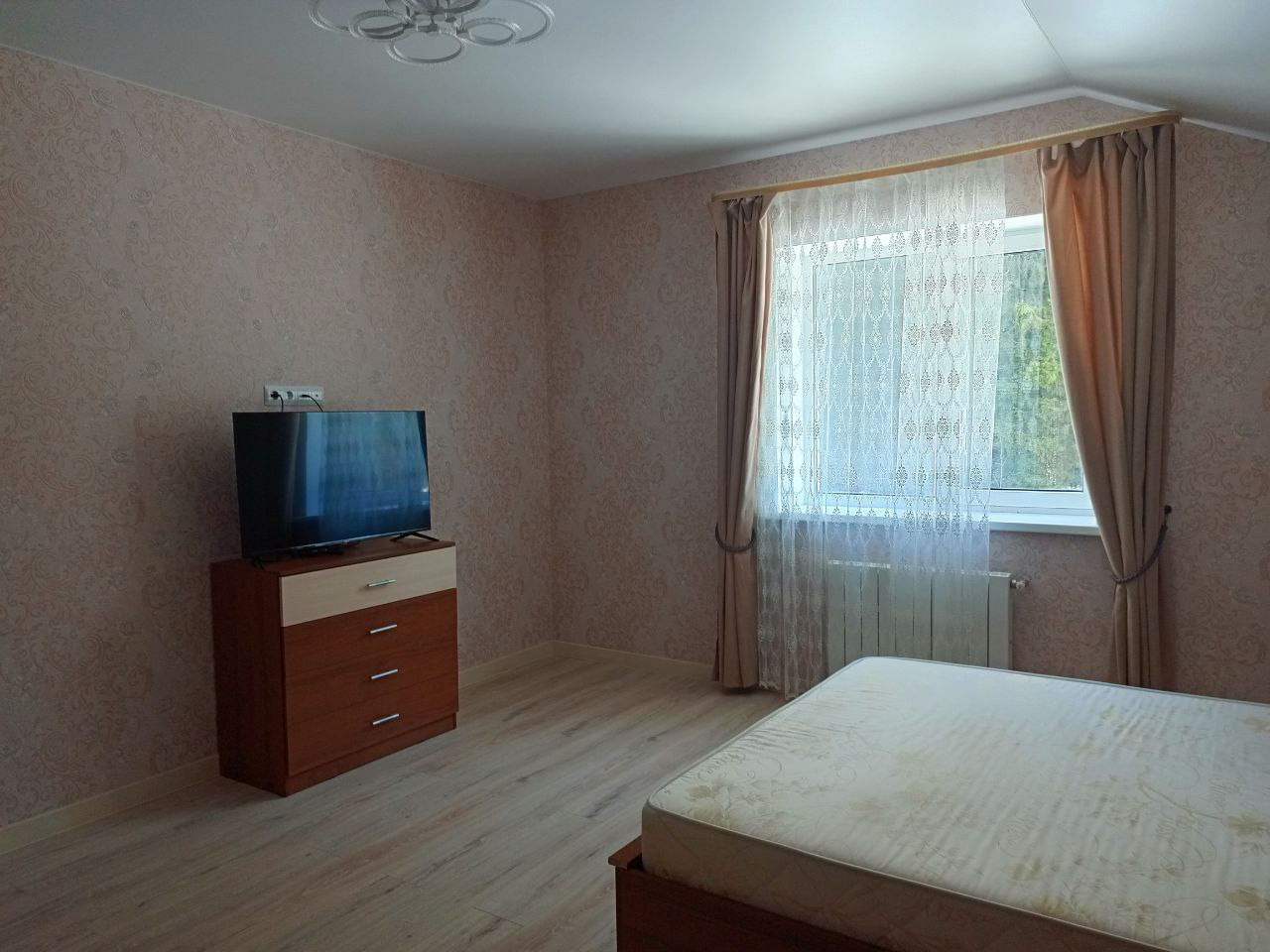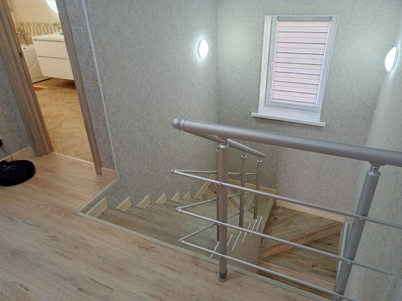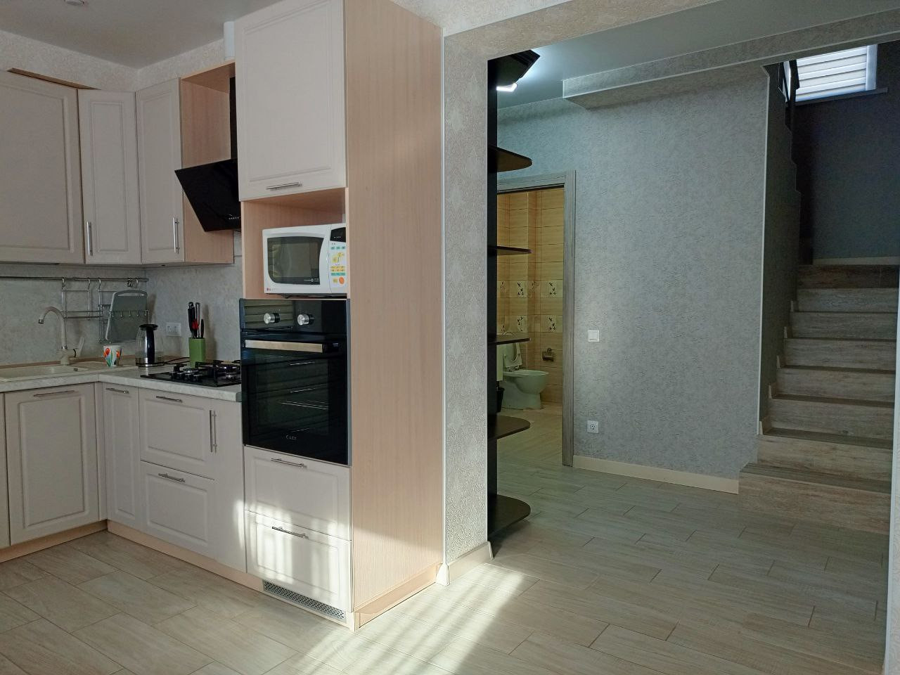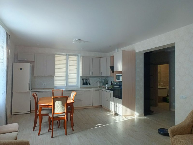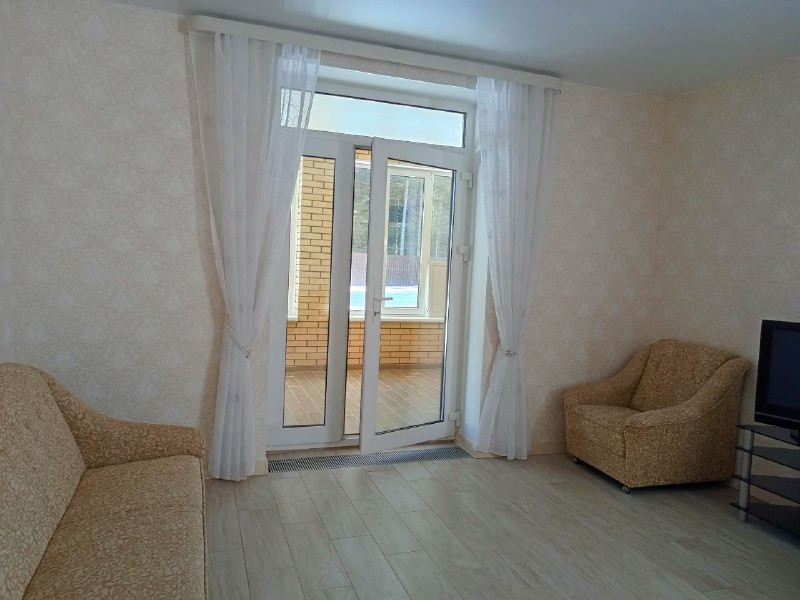 Расположен на двух этажах. На первом: кухня- гостиная 37 м. кв. с выходом на задний двор к сосновому лесу. Кухонная зона оборудована газовой плитой, духовкой, холодильником, микроволновой печью, обеденным столом и стульями, диваном и креслами. Теплыми полами. Прихожая с вместительным шкафом-купе. Два робота-пылесоса. Гостевая комната, санузел со стиральной машиной и душевой кабиной, бойлерная, терраса. На втором этаже три спальни, гардеробная, большая ванная комната, места для хранения. Три телевизора, беспроводной интернет.