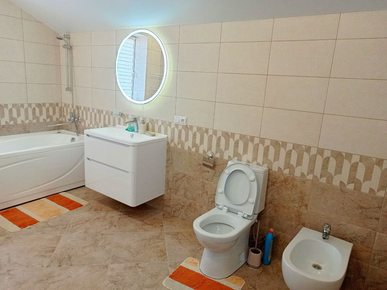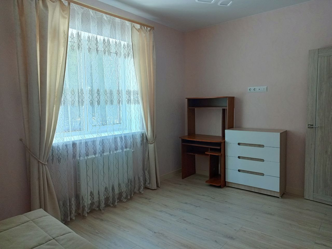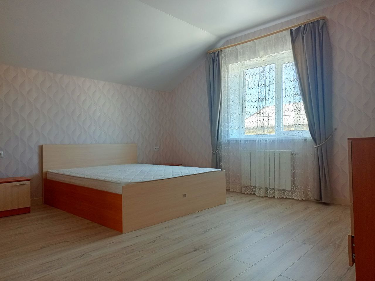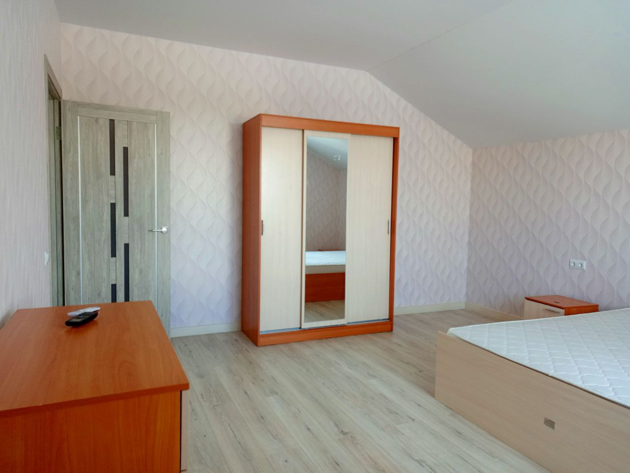 Расположен на двух этажах. На первом: кухня- гостиная 37 м. кв. с выходом на задний двор к сосновому лесу. Кухонная зона оборудована газовой плитой, духовкой, холодильником, микроволновой печью, обеденным столом и стульями, диваном и креслами. Теплыми полами. Прихожая с вместительным шкафом-купе. Два робота-пылесоса. Гостевая комната, санузел со стиральной машиной и душевой кабиной, бойлерная, терраса. На втором этаже три спальни, гардеробная, большая ванная комната, места для хранения. Три телевизора, беспроводной интернет.