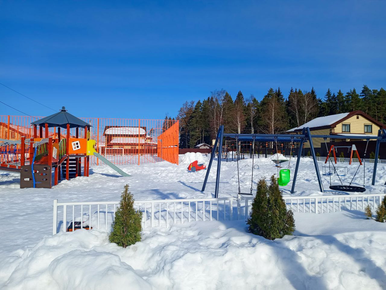 Коттеджный поселок жилой, обустроенный, широкие проезды, детские площадки. При этом обособленная территория, хотя и находится в 500 метрах от шоссе.