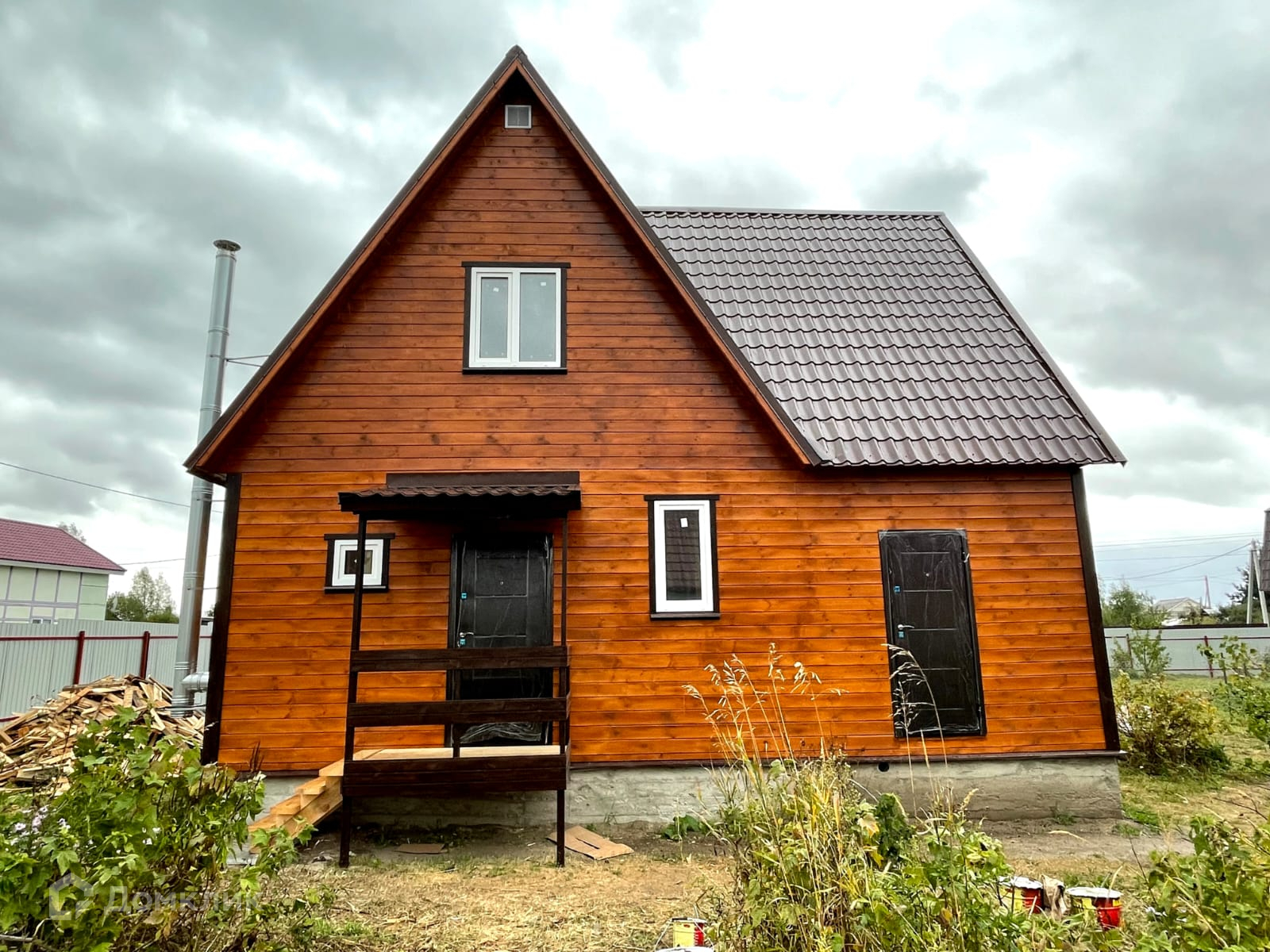 Участок с забором, распашные ворота, калитка, парковка и плитка до дома. Современный дом,полностью готовый для круглогодичного проживания.
