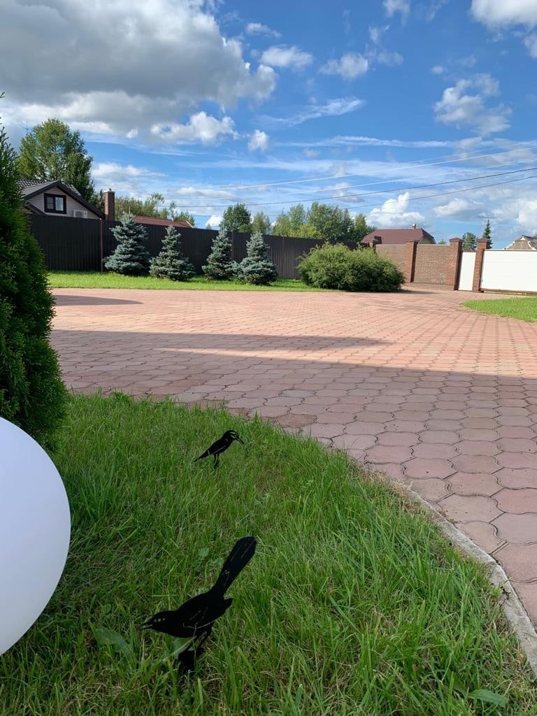 На участке ландшафтный дизайн. Английский газон и тротуарная плитка по всему участку, есть деревья ели, вишня, яблони, смородина - вдоль забора.
