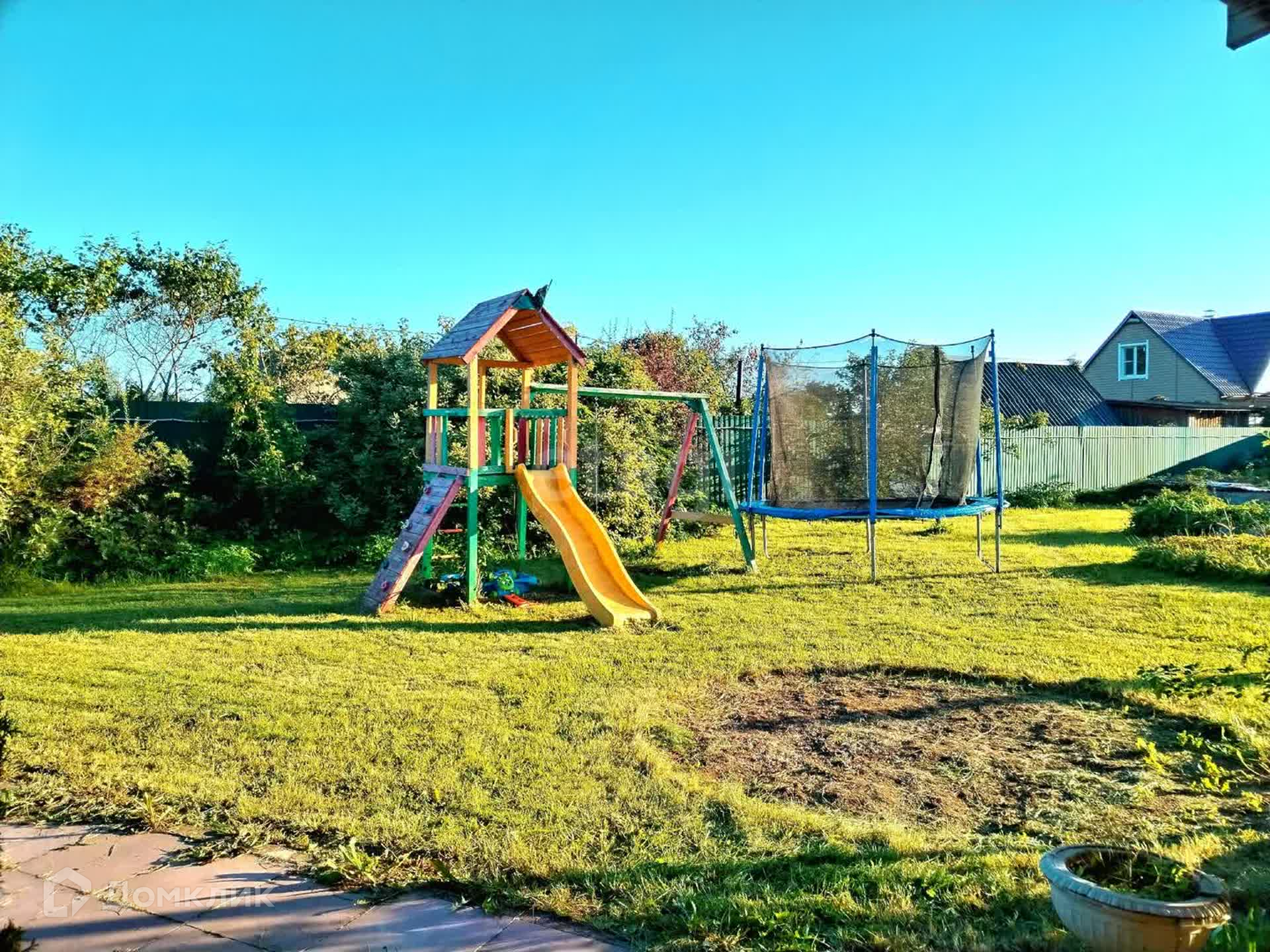 -Мангальная зона, оборудованная под навесом, а рядом детская площадка, качели для отдыха и место для каркасного бассейна.