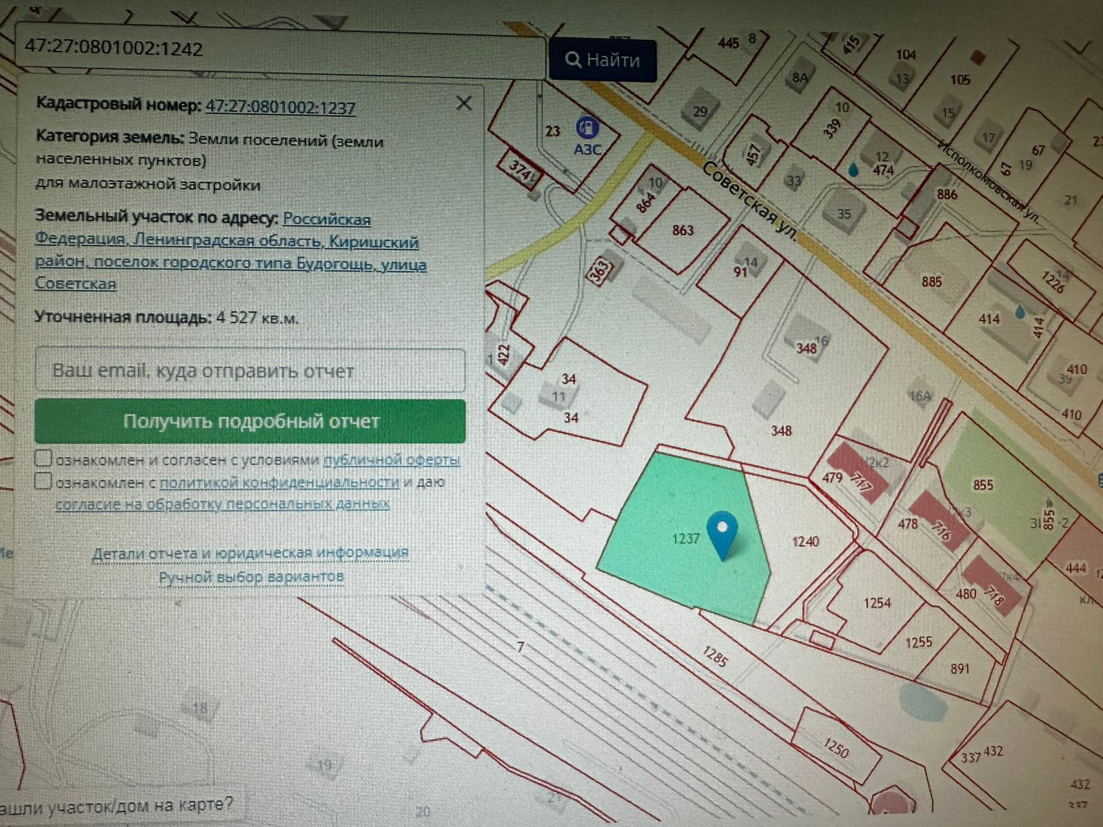 Учacток = 21,03 сoтoк, кадaстровый номep = 47:27:0801002:1240, стоимоcть = 1.000.000 pуб. (план на третьем фoтo)