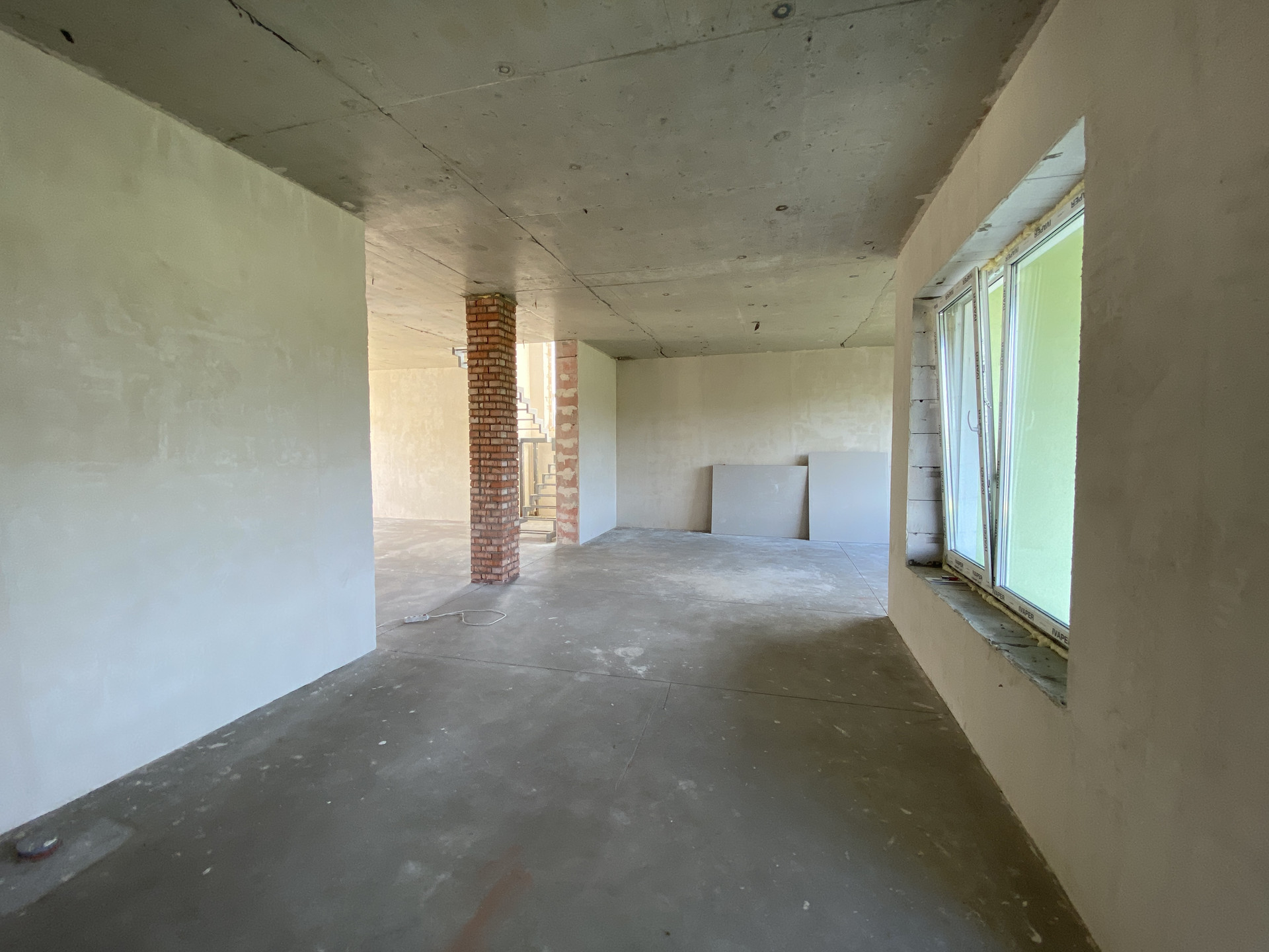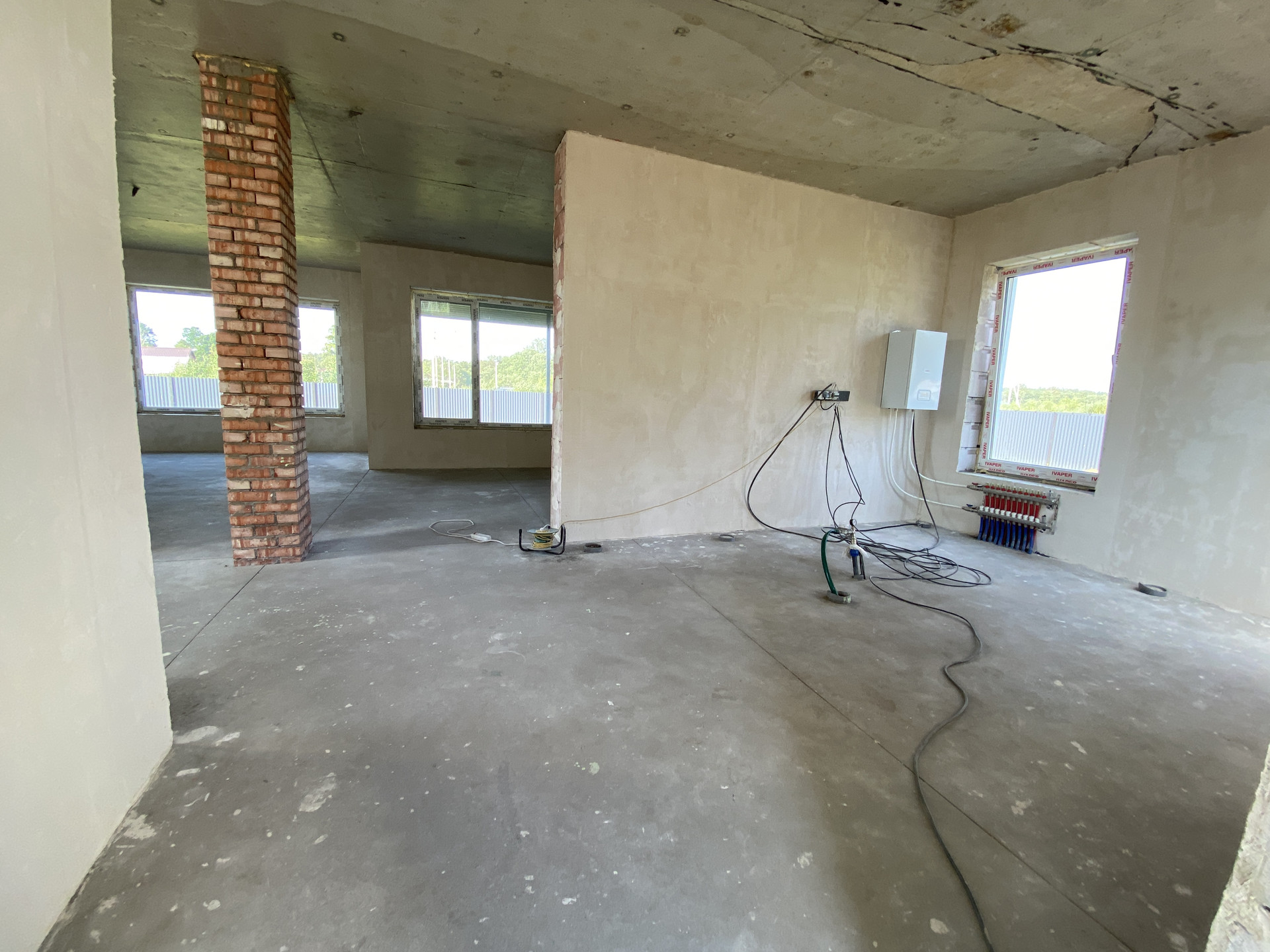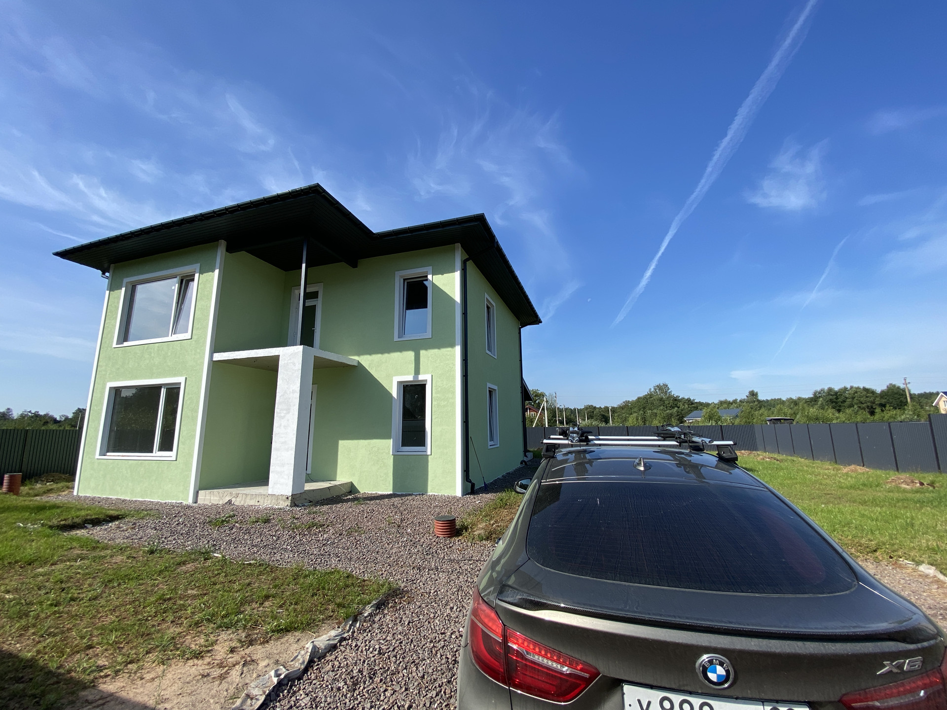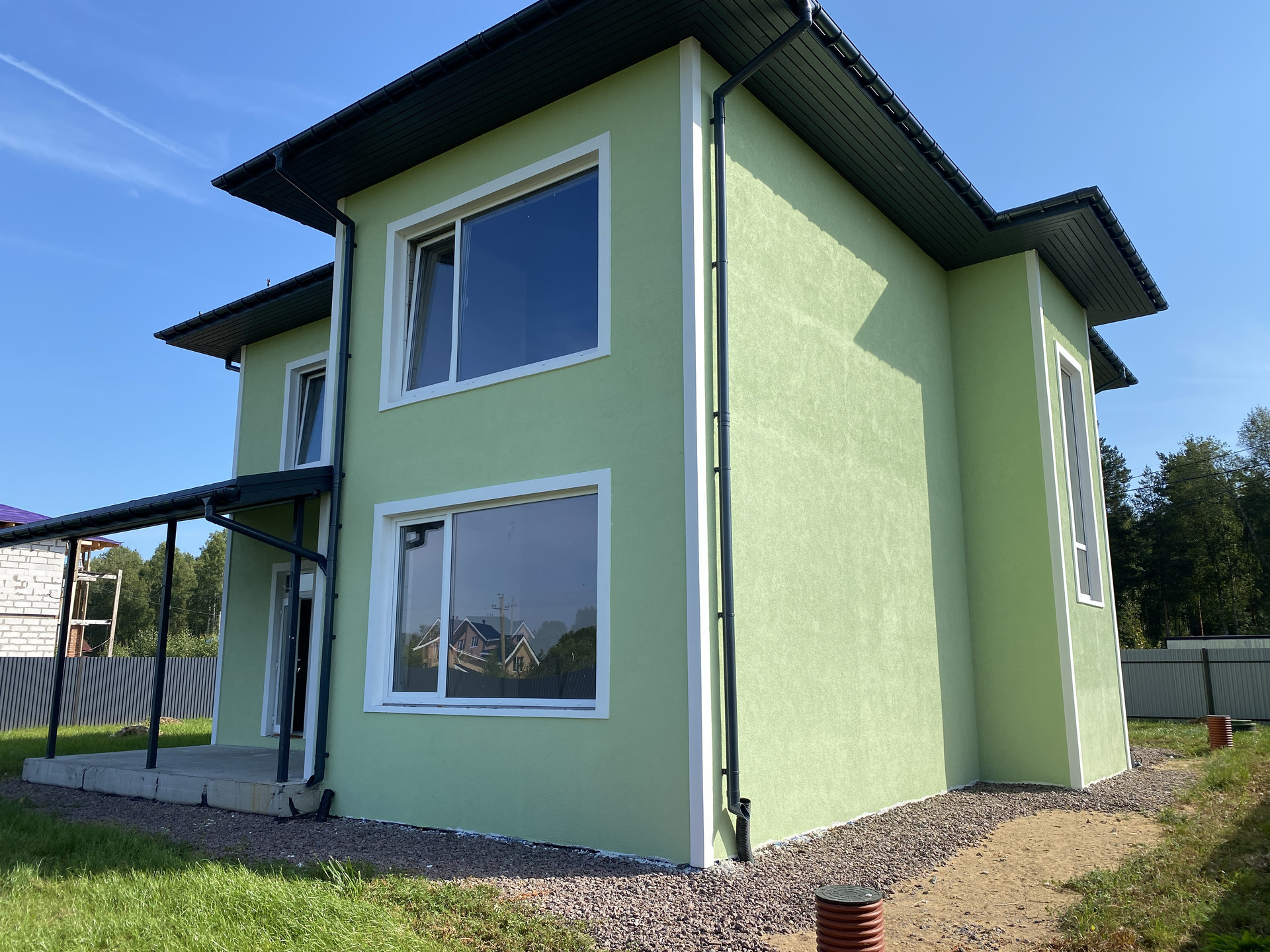 Дом полностью готов внешне по фасаду и экстерьеру. Внутри Дома выполнена предчистовая отделка с заведением коммуникаций в тех зону первого этажа, установлен эл. котел на 14кВт, смонтирована станция ЛОС (водоотведение-канализация), установлены окна, лестница, выполнена система теплых полов на первом этаже, сделана стяжка, стены оштукатурены.