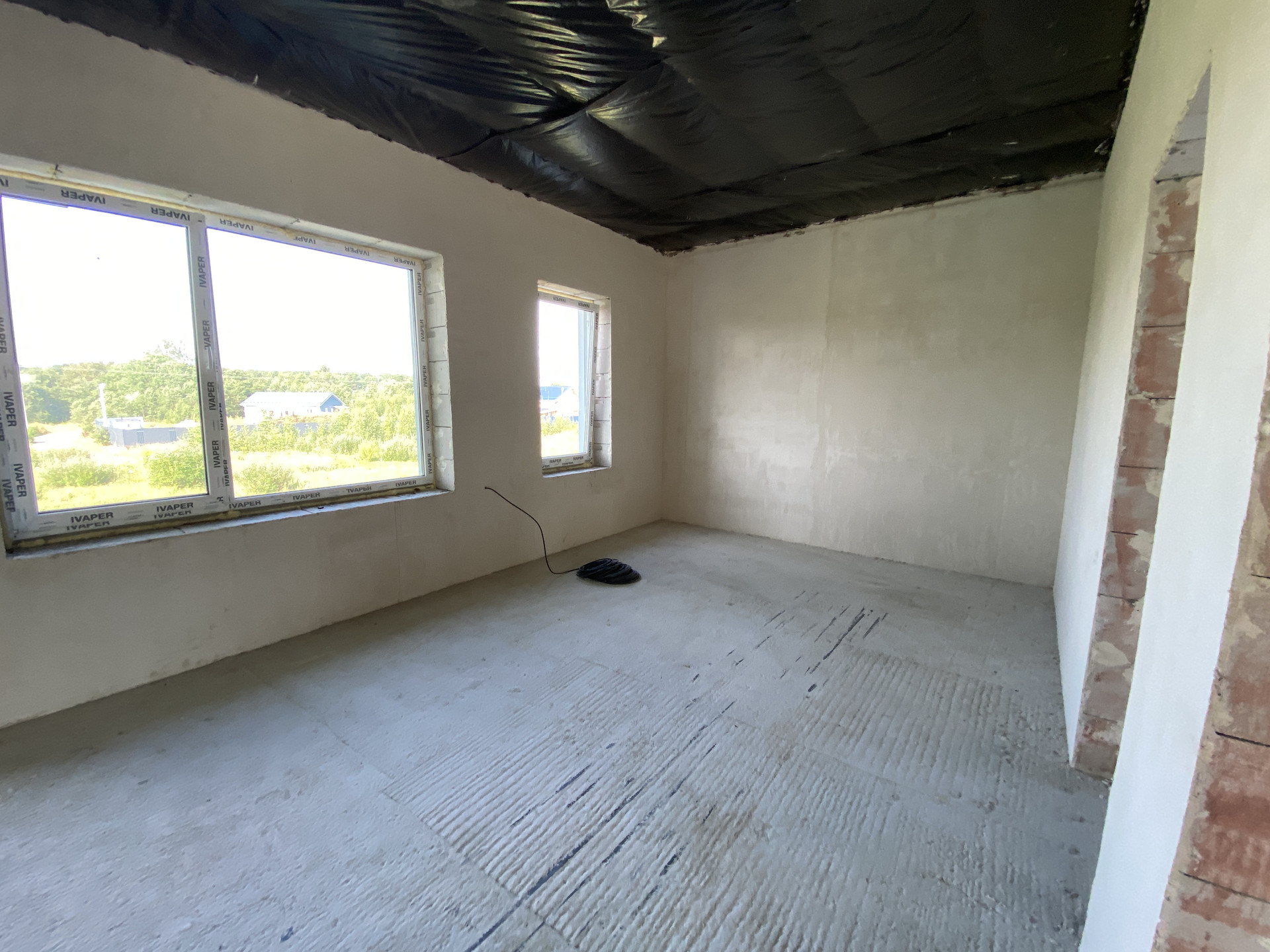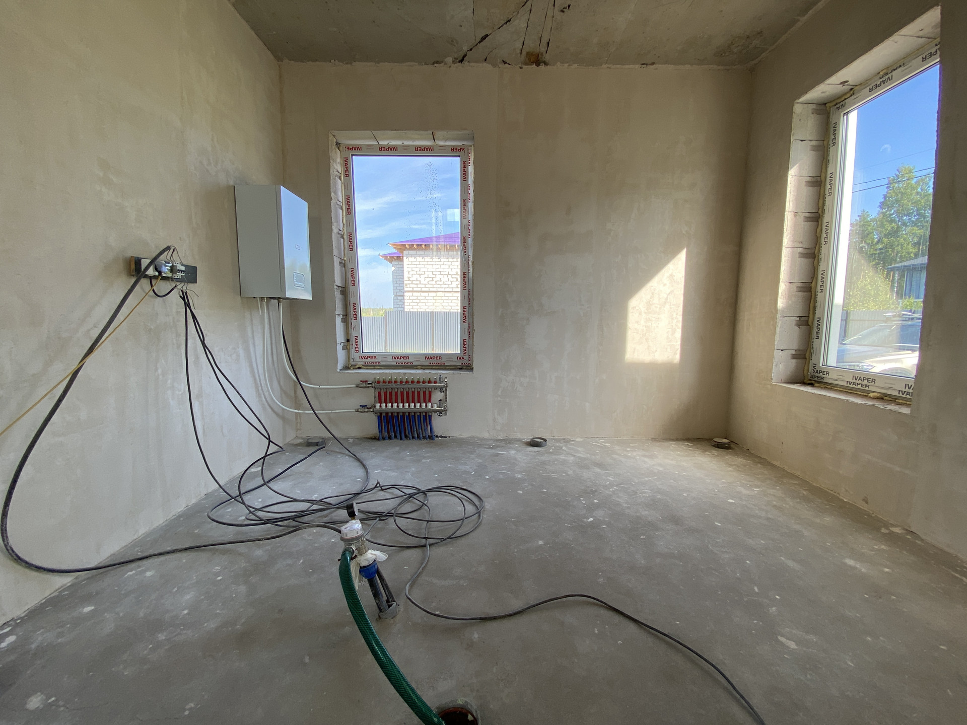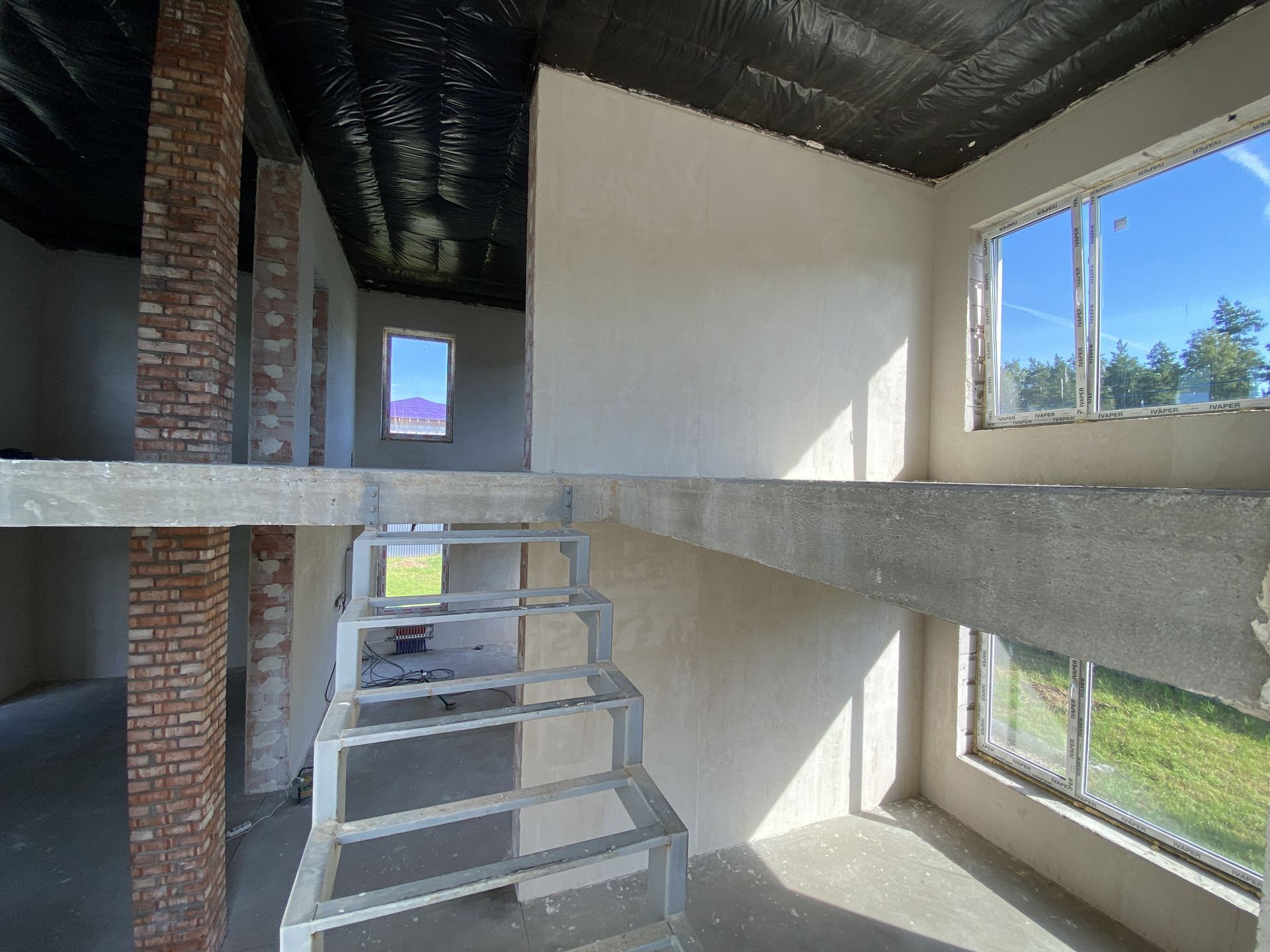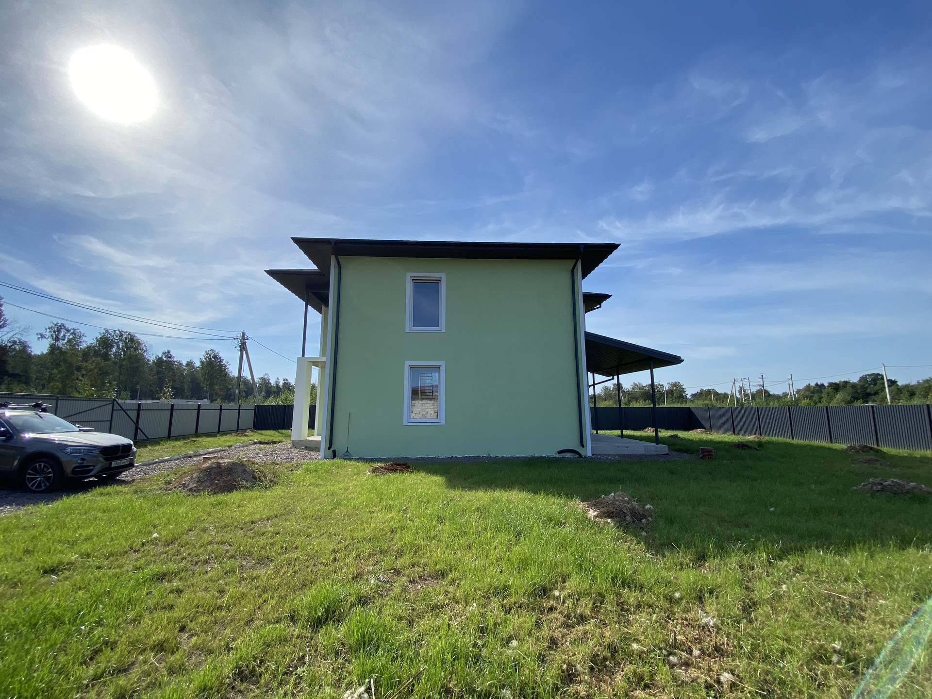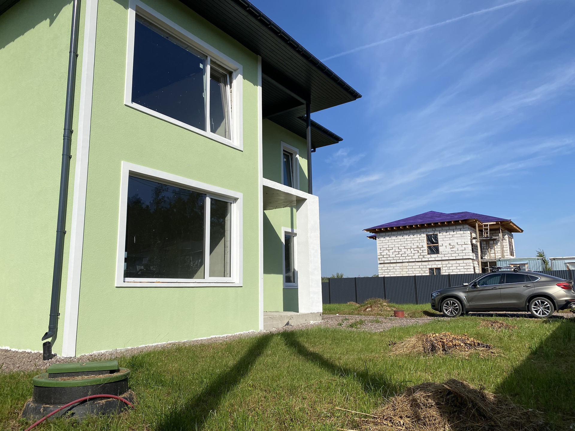 Дом полностью готов внешне по фасаду и экстерьеру. Внутри Дома выполнена предчистовая отделка с заведением коммуникаций в тех зону первого этажа, установлен эл. котел на 14кВт, смонтирована станция ЛОС (водоотведение-канализация), установлены окна, лестница, выполнена система теплых полов на первом этаже, сделана стяжка, стены оштукатурены.