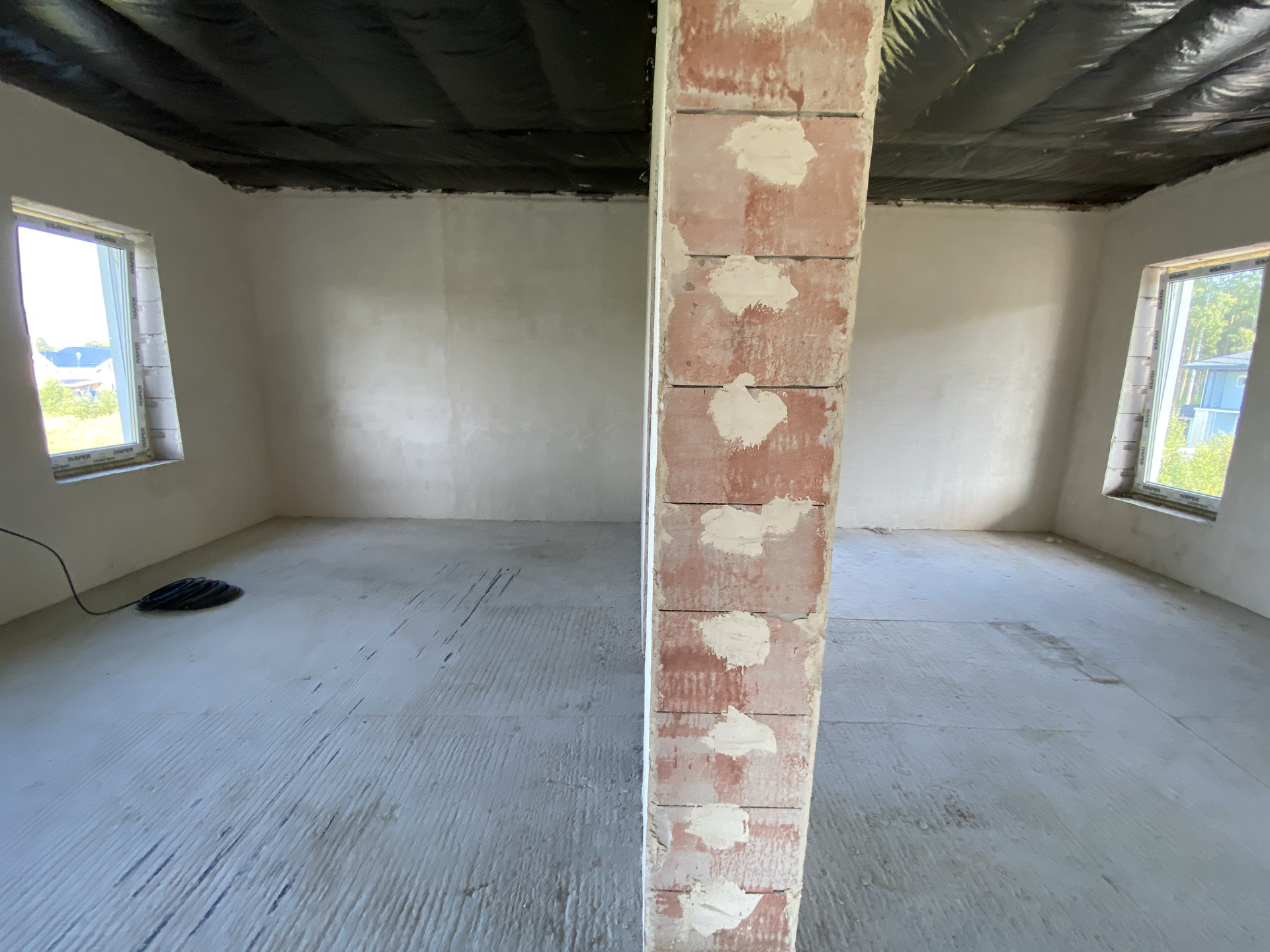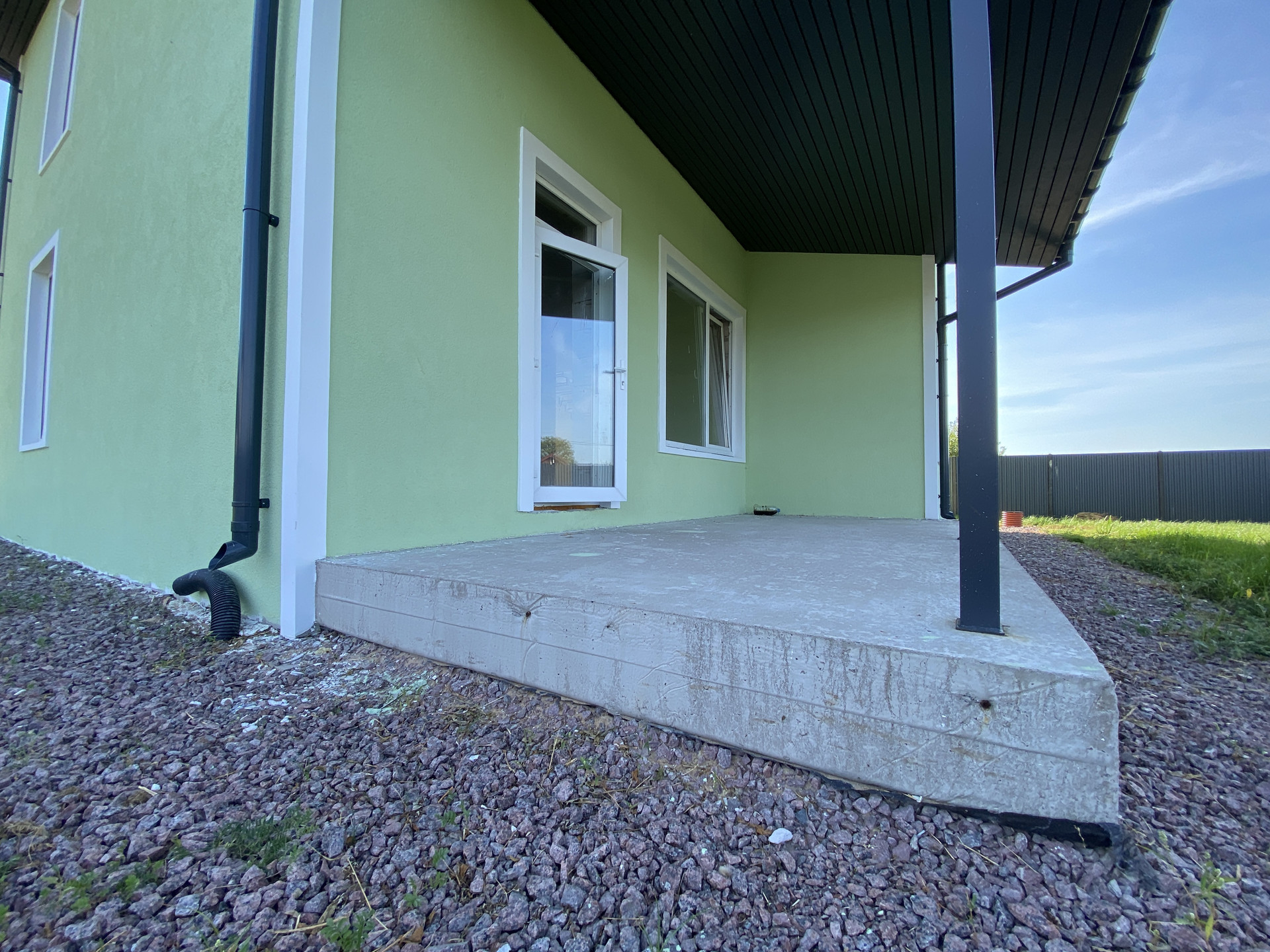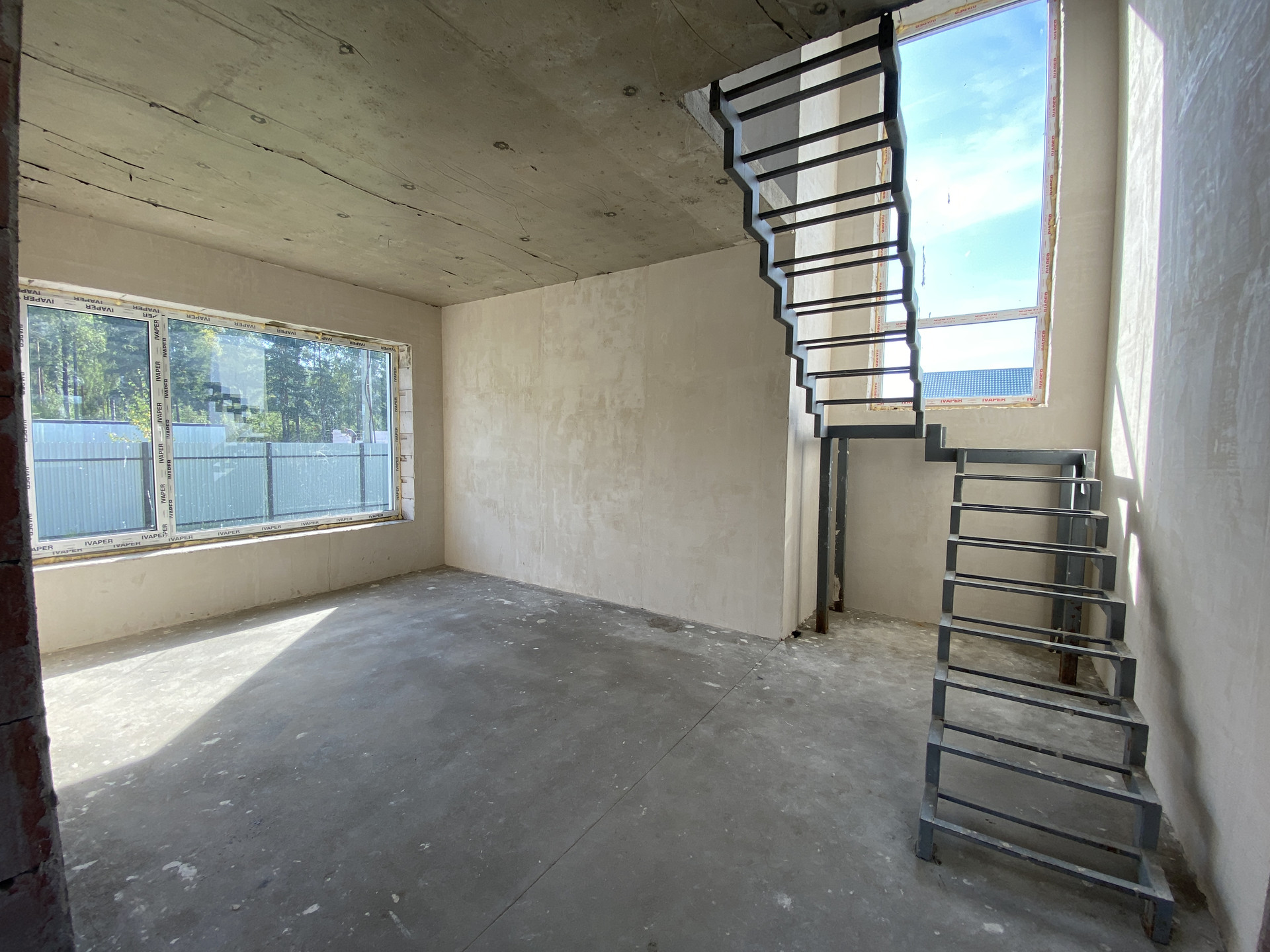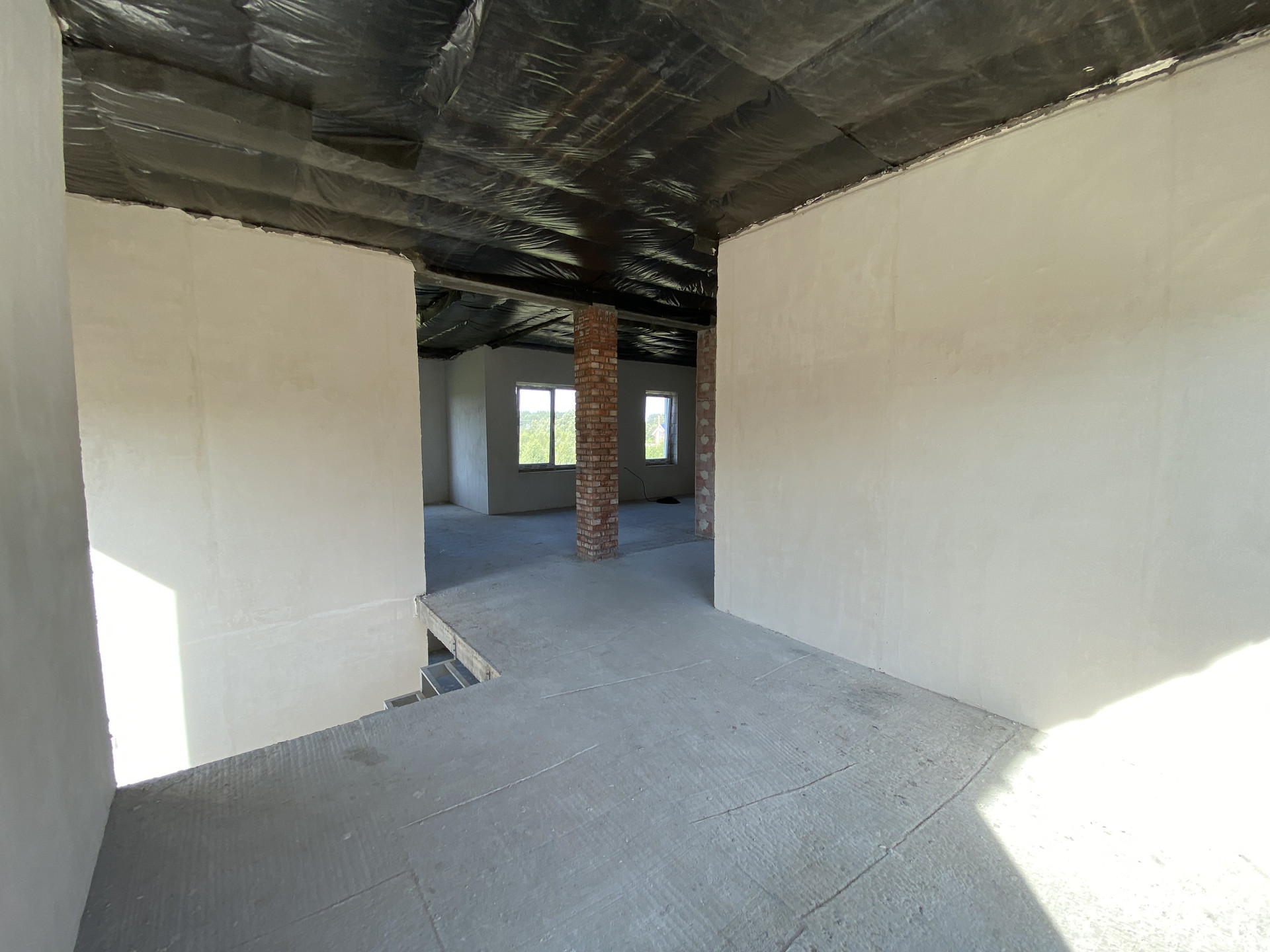 Дом полностью готов внешне по фасаду и экстерьеру. Внутри Дома выполнена предчистовая отделка с заведением коммуникаций в тех зону первого этажа, установлен эл. котел на 14кВт, смонтирована станция ЛОС (водоотведение-канализация), установлены окна, лестница, выполнена система теплых полов на первом этаже, сделана стяжка, стены оштукатурены.