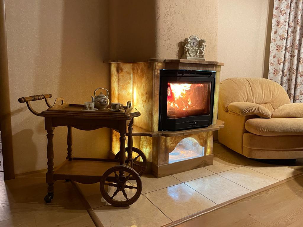 Гостинная 30 кв.м. с шикарным камином из натурального камня оникса.